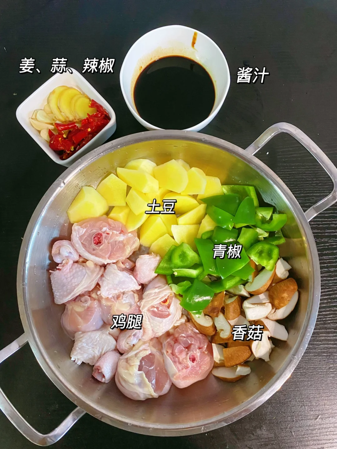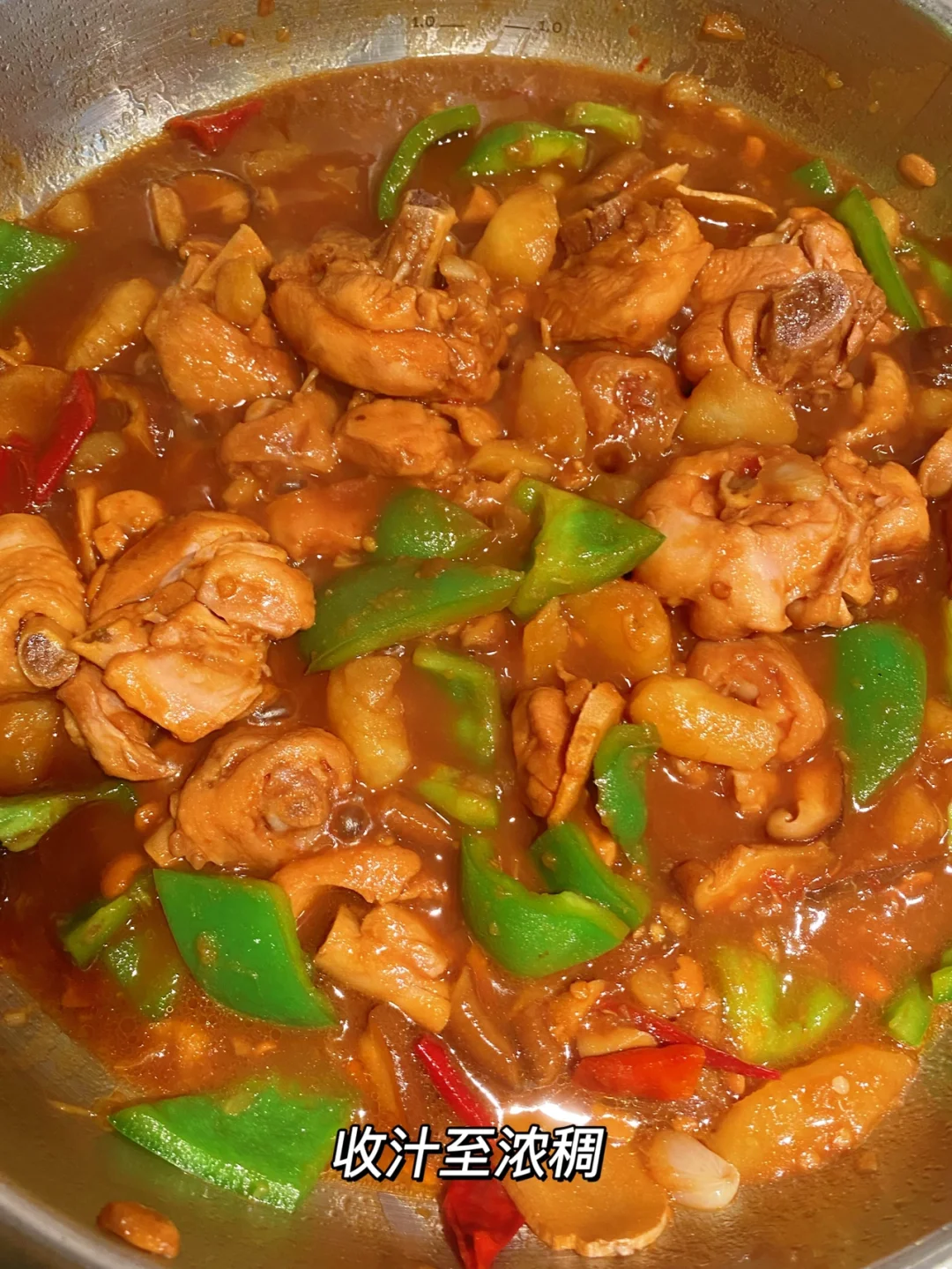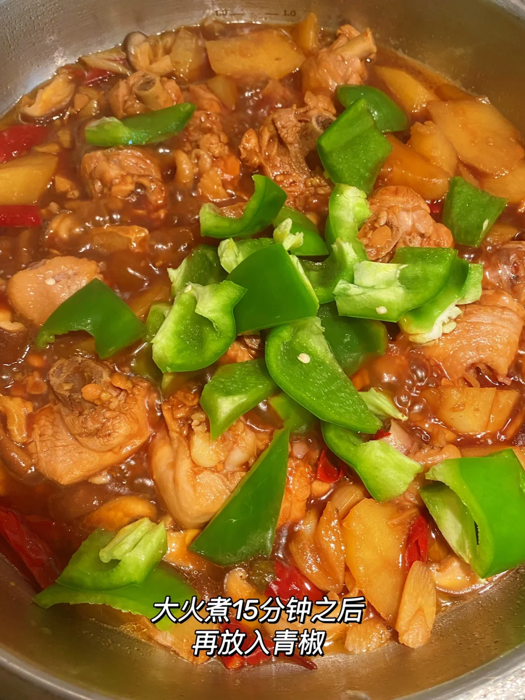 在家居然做出了黄焖鸡!! 太好吃了,超级下饭! 1⃣️准备食材,鸡腿肉,姜、蒜、干辣椒,2勺生抽、1勺老抽、1勺料酒、1勺黄豆酱调个料汁 2⃣️锅里加油之后,加入姜、蒜、干辣椒炒香,加入鸡腿翻炒,倒入酱汁炒至上色,加入适量水,再加入香菇和土豆,烧开之后焖煮15分钟。 3⃣️加入青椒翻炒,收汁至浓稠出锅 完成✅ 哇哦!! 真的太好吃了!! 土豆软软糯糯的绝了!! 汤汁配米饭超好吃[赞R]