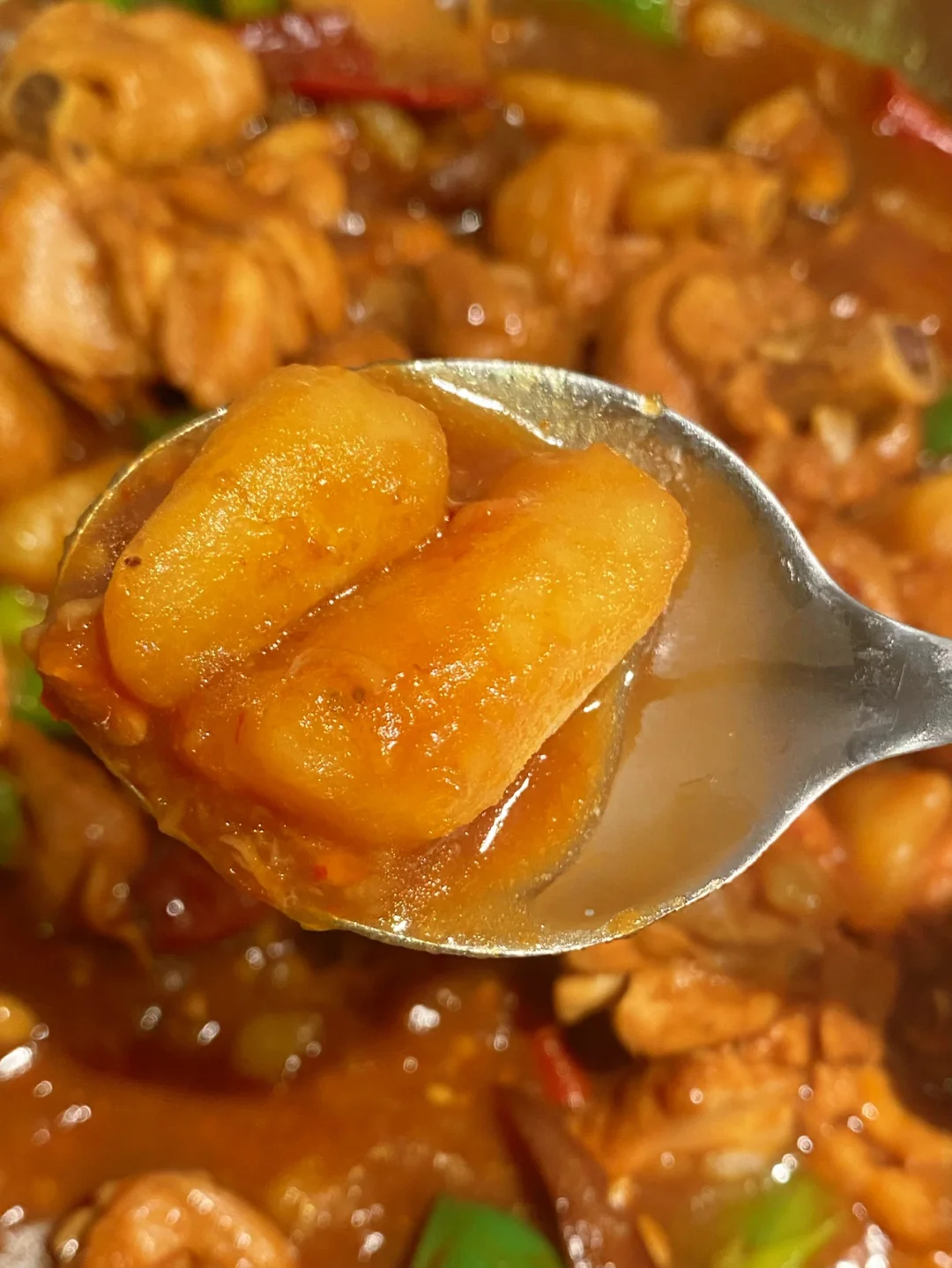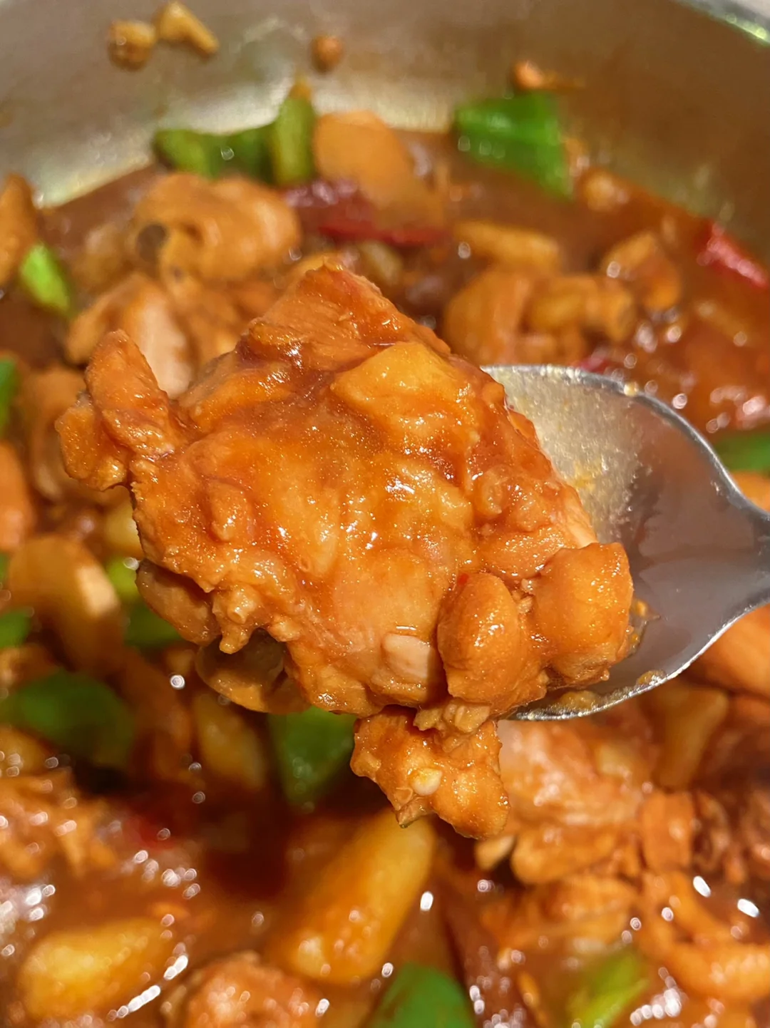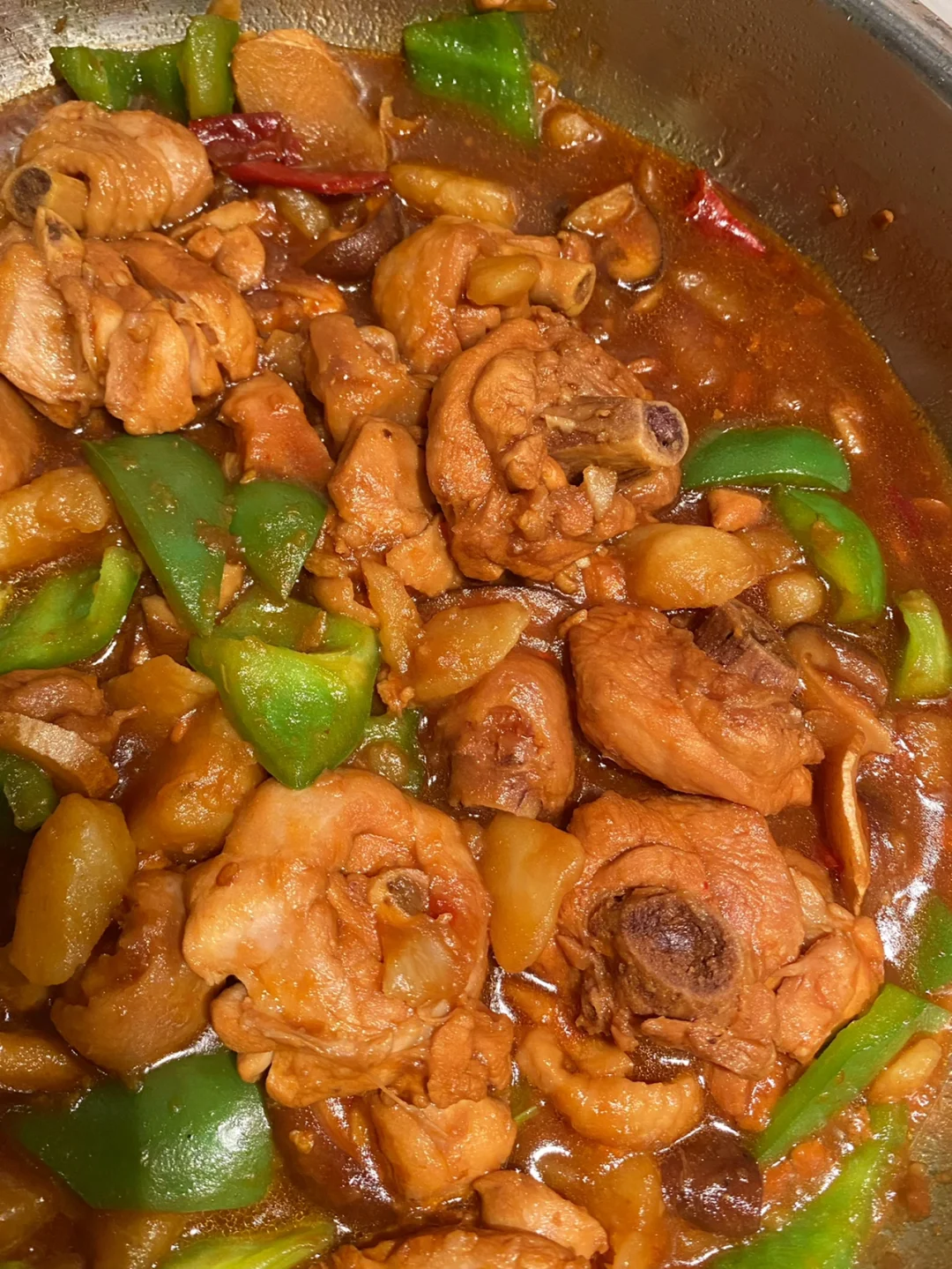 在家居然做出了黄焖鸡!! 太好吃了,超级下饭! 1⃣️准备食材,鸡腿肉,姜、蒜、干辣椒,2勺生抽、1勺老抽、1勺料酒、1勺黄豆酱调个料汁 2⃣️锅里加油之后,加入姜、蒜、干辣椒炒香,加入鸡腿翻炒,倒入酱汁炒至上色,加入适量水,再加入香菇和土豆,烧开之后焖煮15分钟。 3⃣️加入青椒翻炒,收汁至浓稠出锅 完成✅ 哇哦!! 真的太好吃了!! 土豆软软糯糯的绝了!! 汤汁配米饭超好吃[赞R]