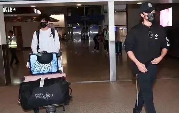 谢霆锋与16岁长子现身机场! 谢霆锋在摆pose,儿子推着车,背着包,看着更像