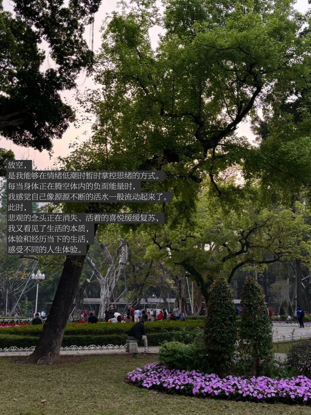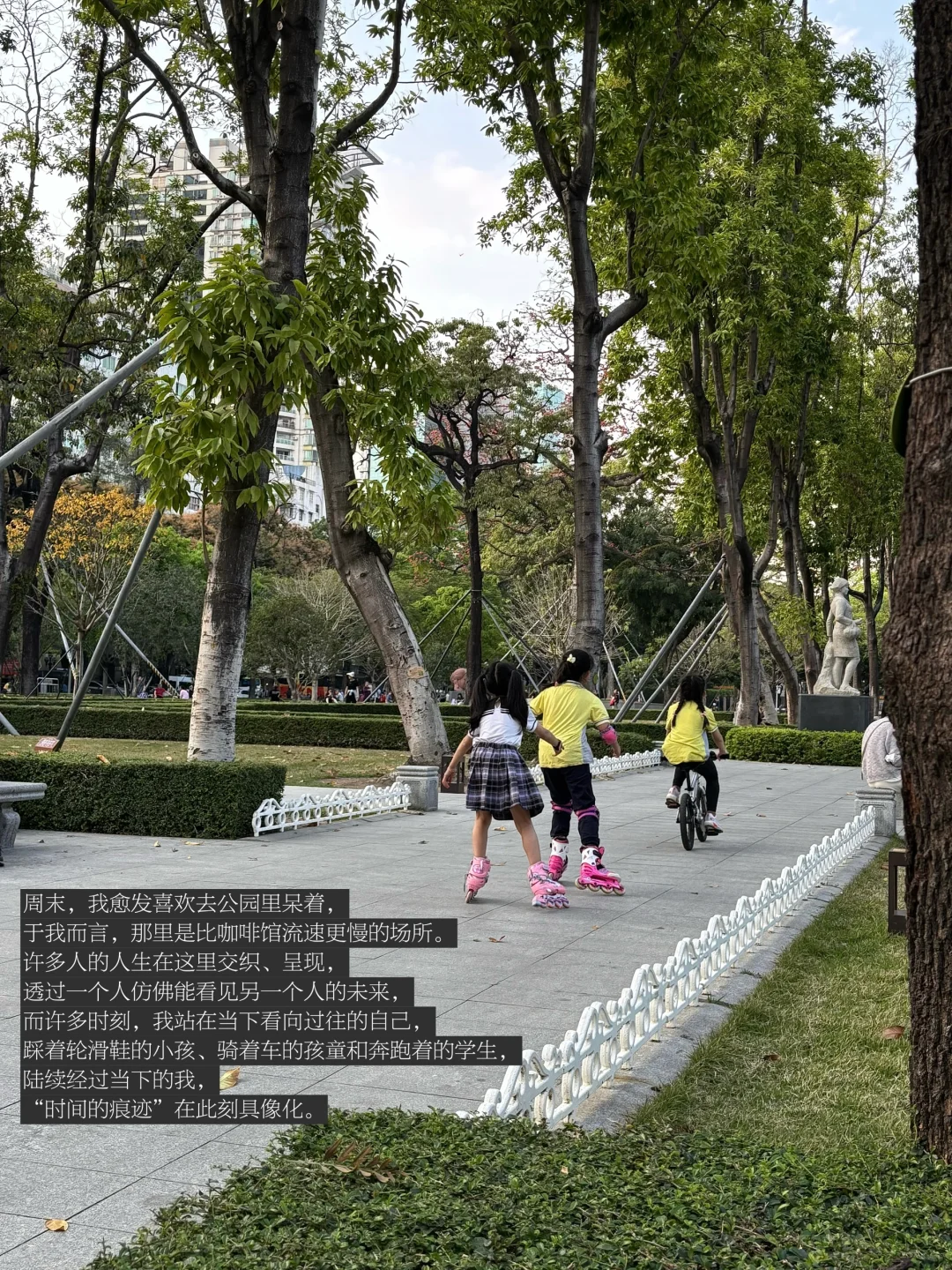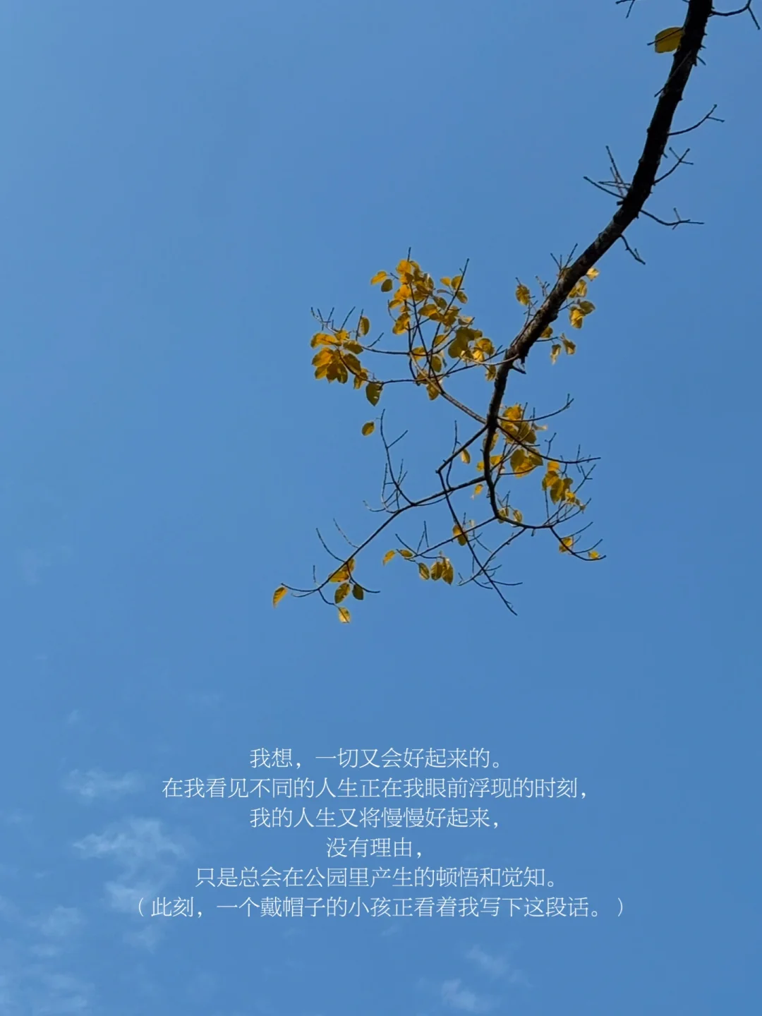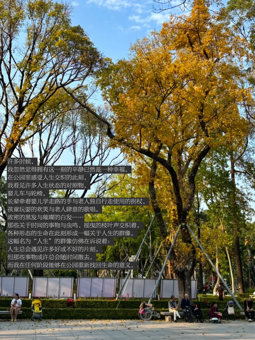 我想,一切又会好起来的。在我看见不同的人生正在我眼前浮现的时刻,我的人生又将慢慢好起来,没有理由,只是总会在公园里产生的顿悟和觉知。