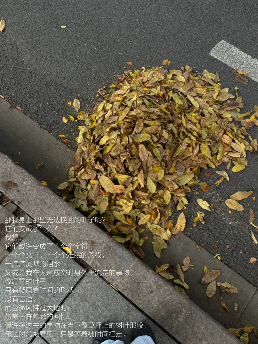 那我身上那些无法挽回的叶子呢?它们变成了什么?我想,它们或许变成了一个个字符,一个个文字,一个个难眠的深夜,一滴滴沉默的泪水,又或是我在无声放空时身体里流走的事物。像凋零的叶子,只有凝固着时间的形状,没有言语,而当微风拂过大地时,带来一阵熟悉的回忆。但许多过去的事物在当下像草坪上的树叶那般,无法时常被看见,只是等着被时间扫走