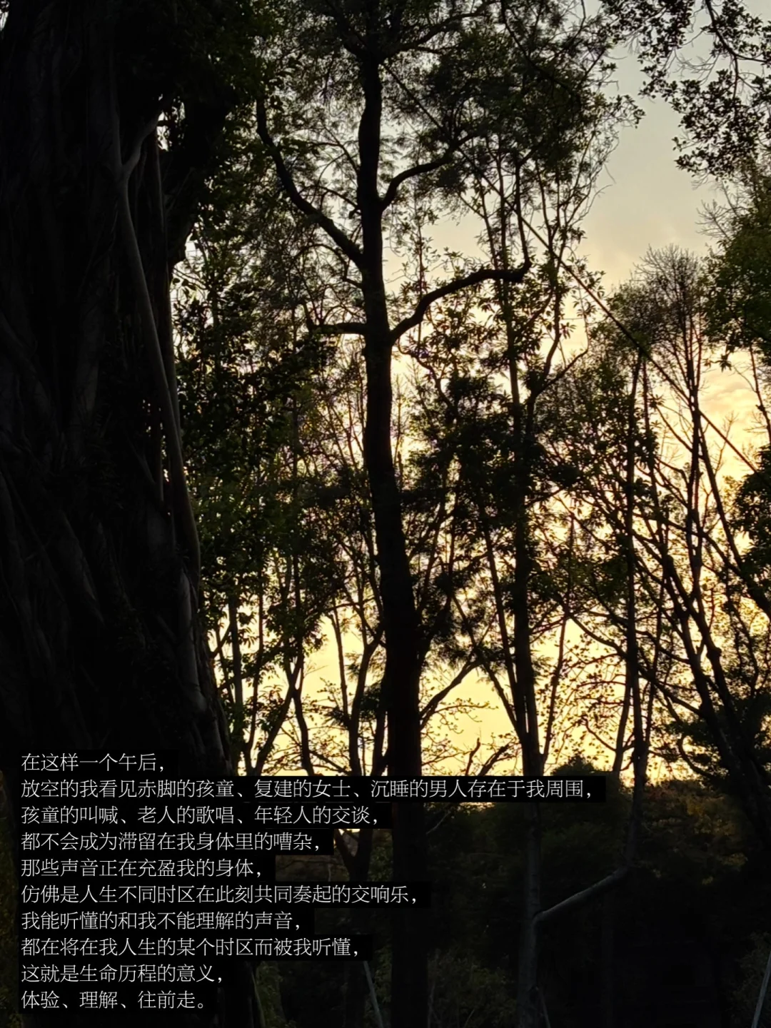 在这样一个午后,放空的我看见赤脚的孩童、复建的女士、沉睡的男人存在于我周围,孩童的叫喊、老人的歌唱、年轻人的交谈都不会成为滞留在我身体里的嘈杂,那些声音正在充盈我的身体,仿佛是人生不同时区在此刻共同奏起的交响乐,我能听懂的和我不能理解的声音都在将在我人生的某个时区而被我听懂,这就是生命历程的意义,体验、理解、往前走。