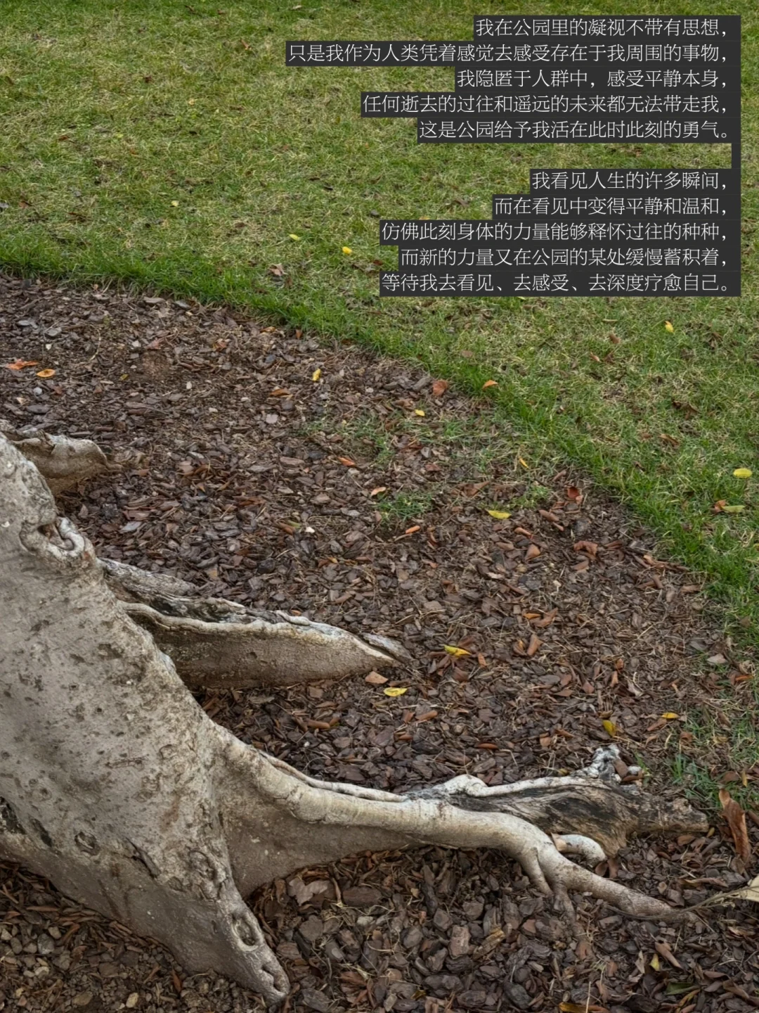 我隐匿于人群中,感受平静本身,任何逝去的过往和遥远的未来都无法带走我,这是公园给予我活在此时此刻的勇气。我看见人生的许多瞬间,而在看见中变得平静和温和,仿佛此刻身体的力量能够释怀过往的种种,而新的力量又在公园的某处缓慢蓄积着,等待我去看见、去感受、去深度疗愈自己。