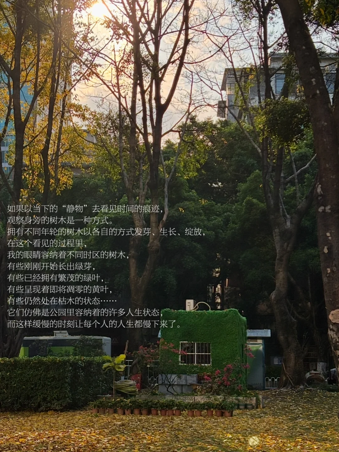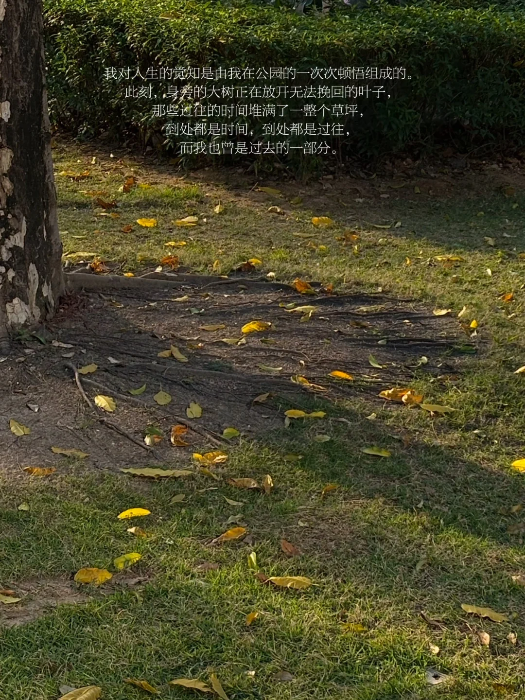 我对人生的觉知是由我在公园的一次次顿悟组成的。此刻,身旁的大树正在放开无法挽回的叶子,那些过往的时间堆满了一整个草坪,到处都是时间,到处都是过往,而我也曾是过去的一部分。
