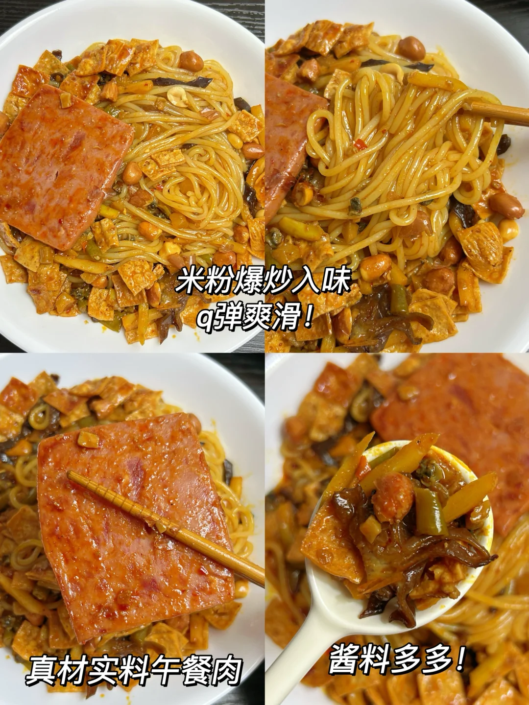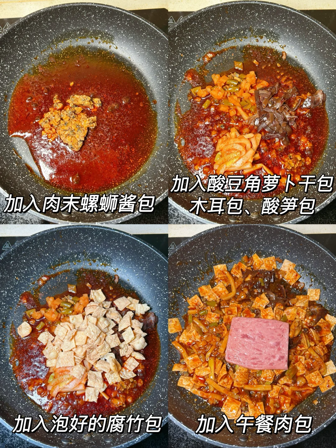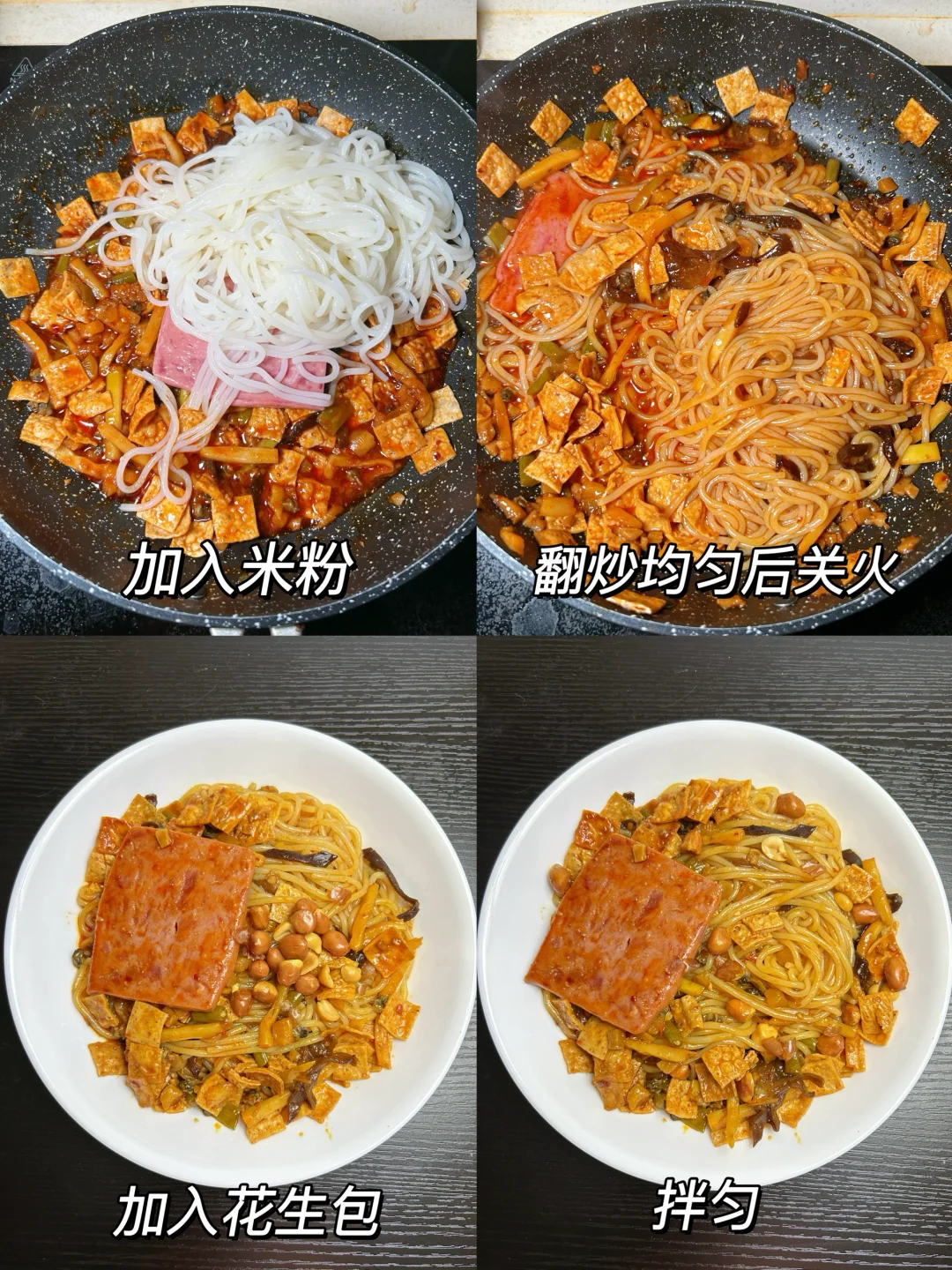 米粉煮熟,过凉水沥干水分备用。锅烧热后加入浓香猪油包,然后加入爆炒辣酱包、肉末螺蛳酱包超香,再依次加入酸豆角萝卜干、木耳、酸笋包、泡好的腐竹、午餐肉,最后加入米粉炒入味出锅。出锅后加入花生包,拌匀即可。