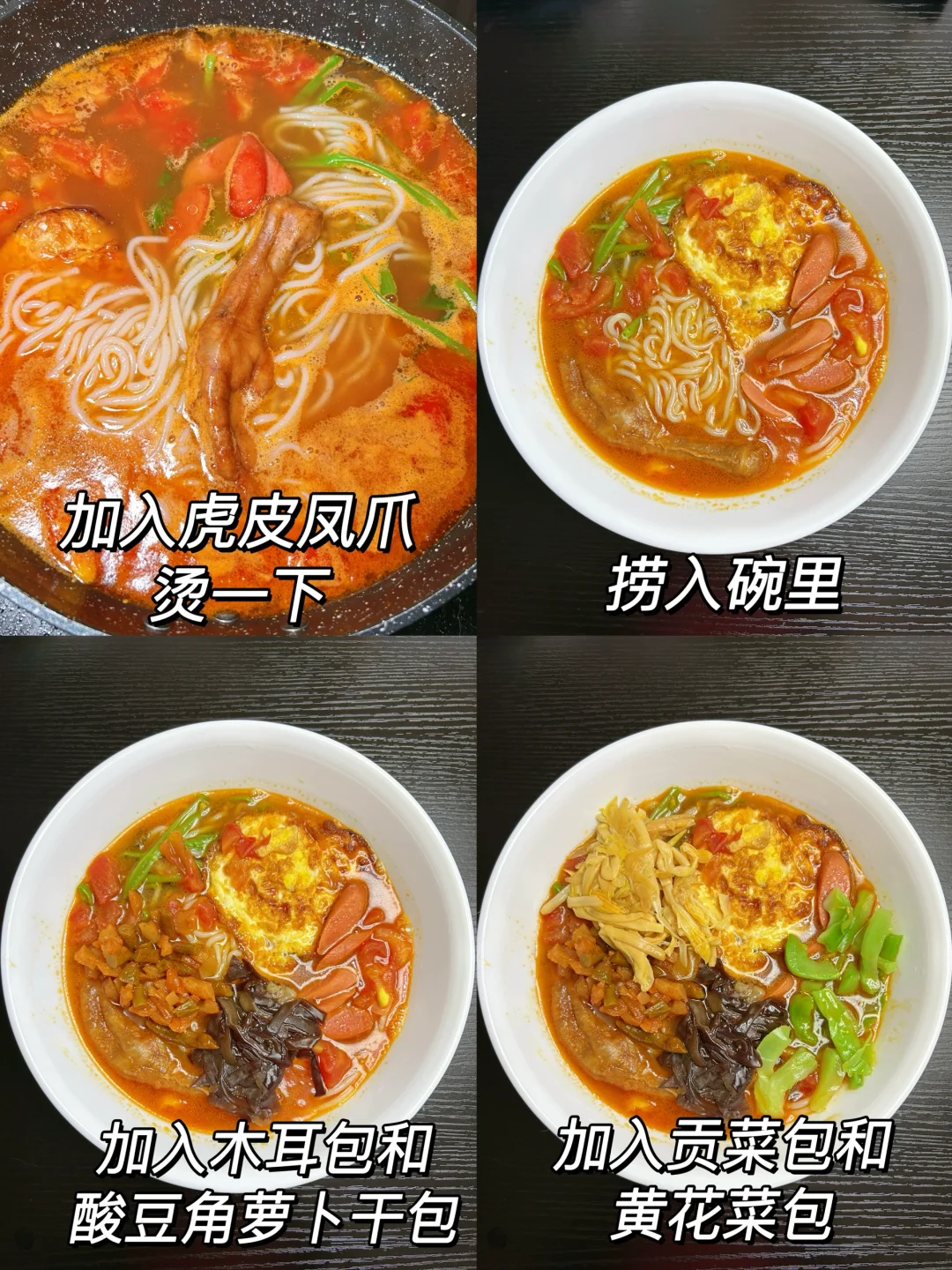 2、 番茄去皮切丁,炒出汁水。加入螺蛳汤料包炒香,加入一碗水煮开。加入刚才的米粉、空心菜、火腿肠、鸡蛋,再加入虎皮凤爪烫一下倒入碗里。