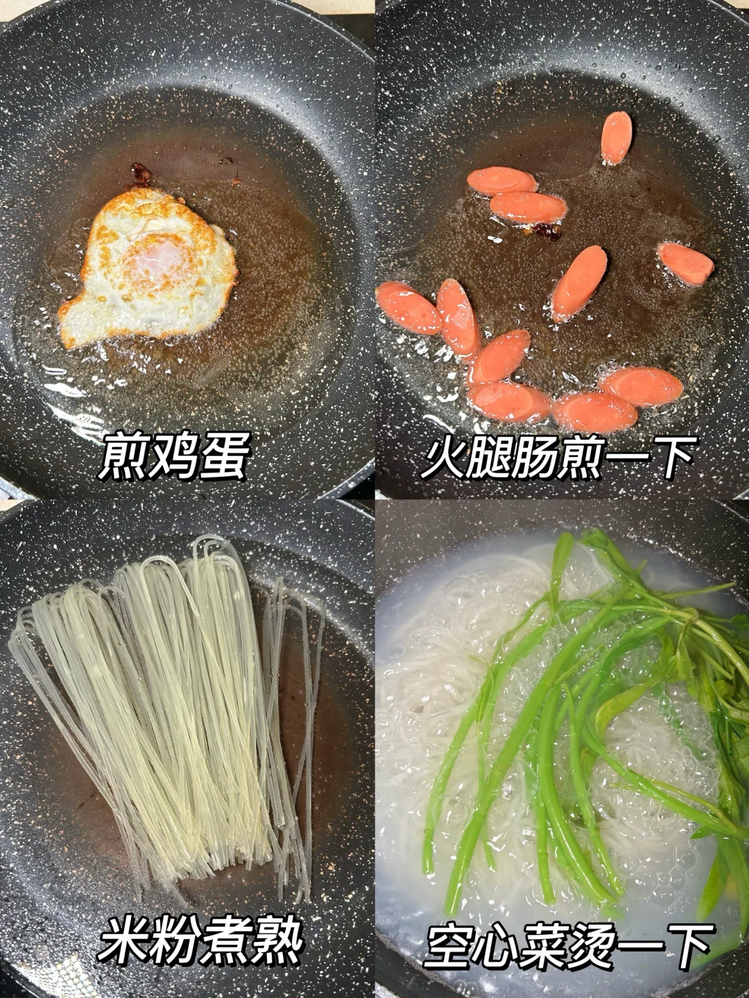1、 煎鸡蛋、煎火腿肠备用,米粉煮熟,空心菜烫一下;