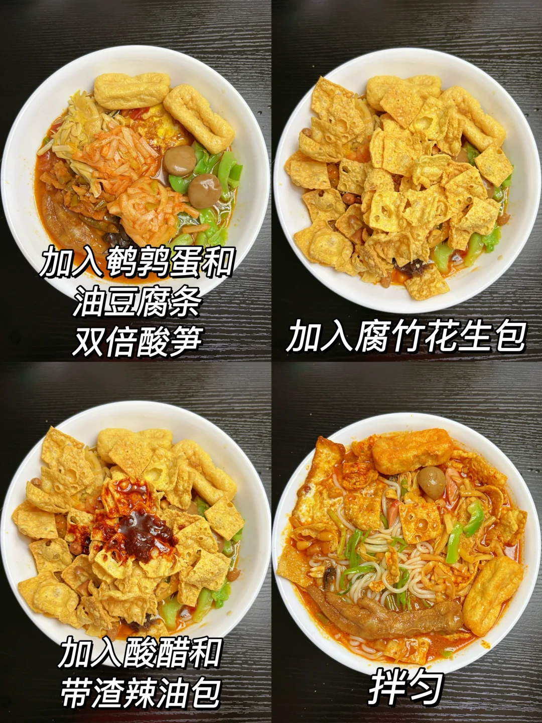 3、依次加入木耳包、酸豆角萝卜干包、贡菜包、黄花菜包、鹌鹑蛋、油豆腐条、双倍酸笋、腐竹花生包,最后加入酸醋和带渣辣油包,拌匀即可。