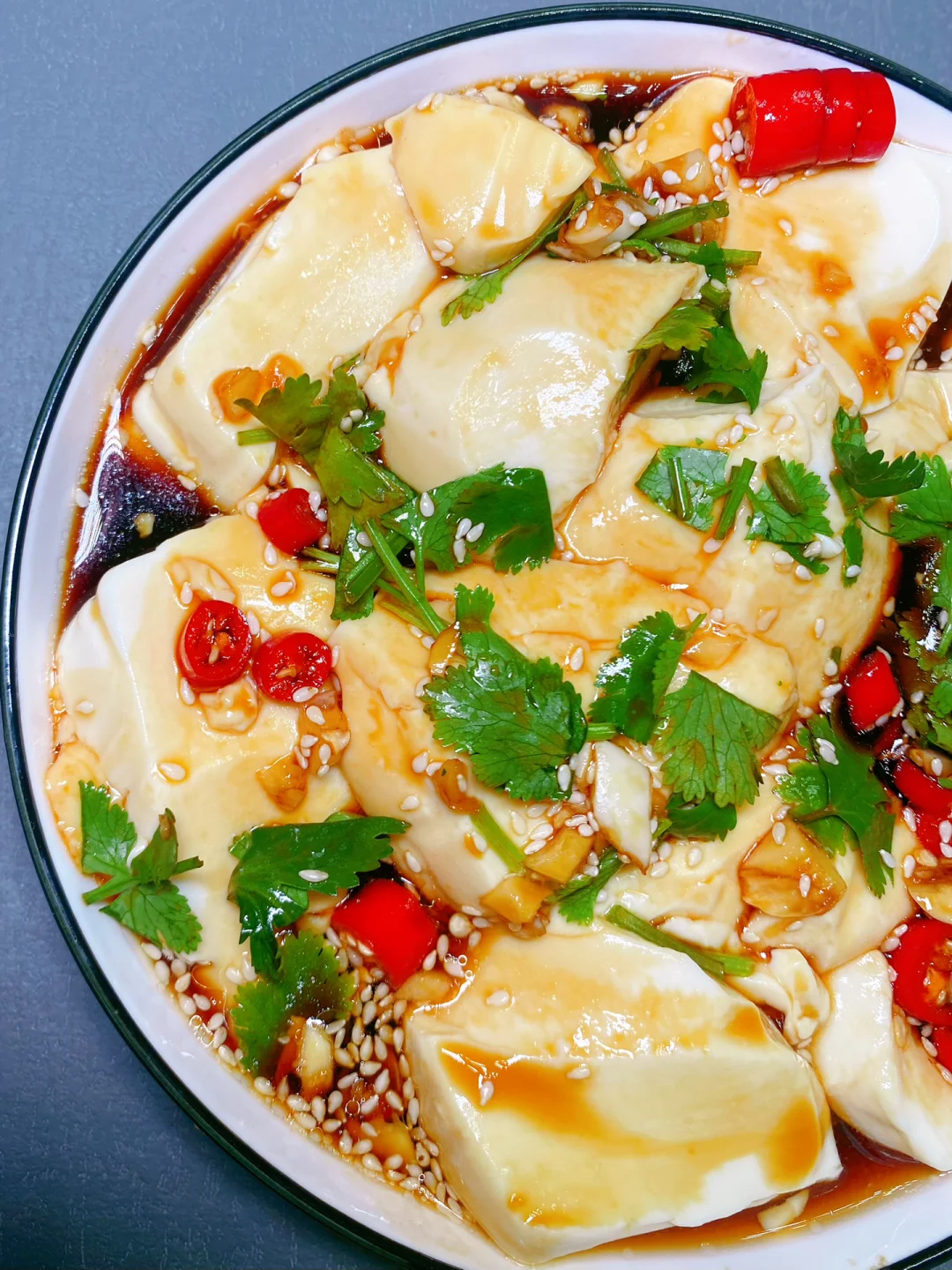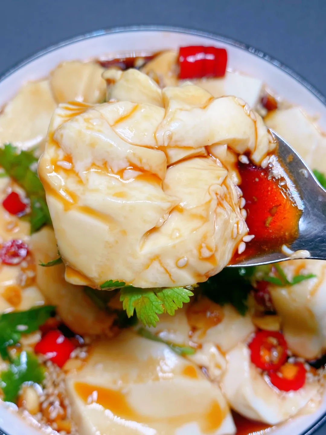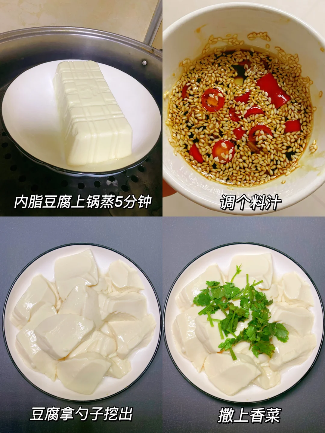 内脂豆腐这么做 太好吃了吧! 1⃣️内脂豆腐上锅蒸5分钟,用勺子挖出放入盘子里 2⃣️调个料汁,料汁比例:小米辣、1勺蚝油、1勺生抽、1勺香醋、白芝麻、1勺香油 3⃣️豆腐上撒上香菜,倒入料汁拌匀 完成✅ 太香啦!! 清爽的感觉