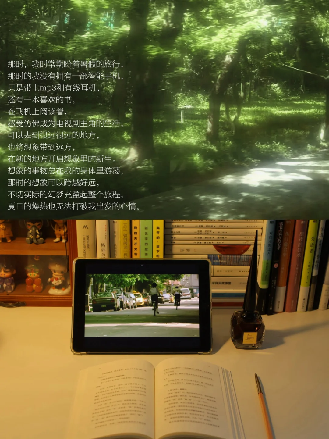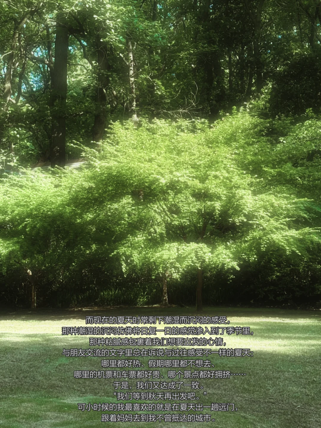 现在的夏天时常剩下潮湿而沉闷的感受,潮湿的沉闷仿佛将日复一日的感觉渗入到了季节里,那种粘腻感包裹着我们想要出发的心情,与朋友交流的文字里总在诉说与过往感受不一样的夏天:哪里都好热、哪里的机票和车票都好贵、哪个景点都好拥挤。于是,我们又达成了一致。“我们等到秋天再出发吧。”可小时候的我最喜欢的就是在夏天出一趟远门,跟着妈妈去到我不曾抵达的城市。