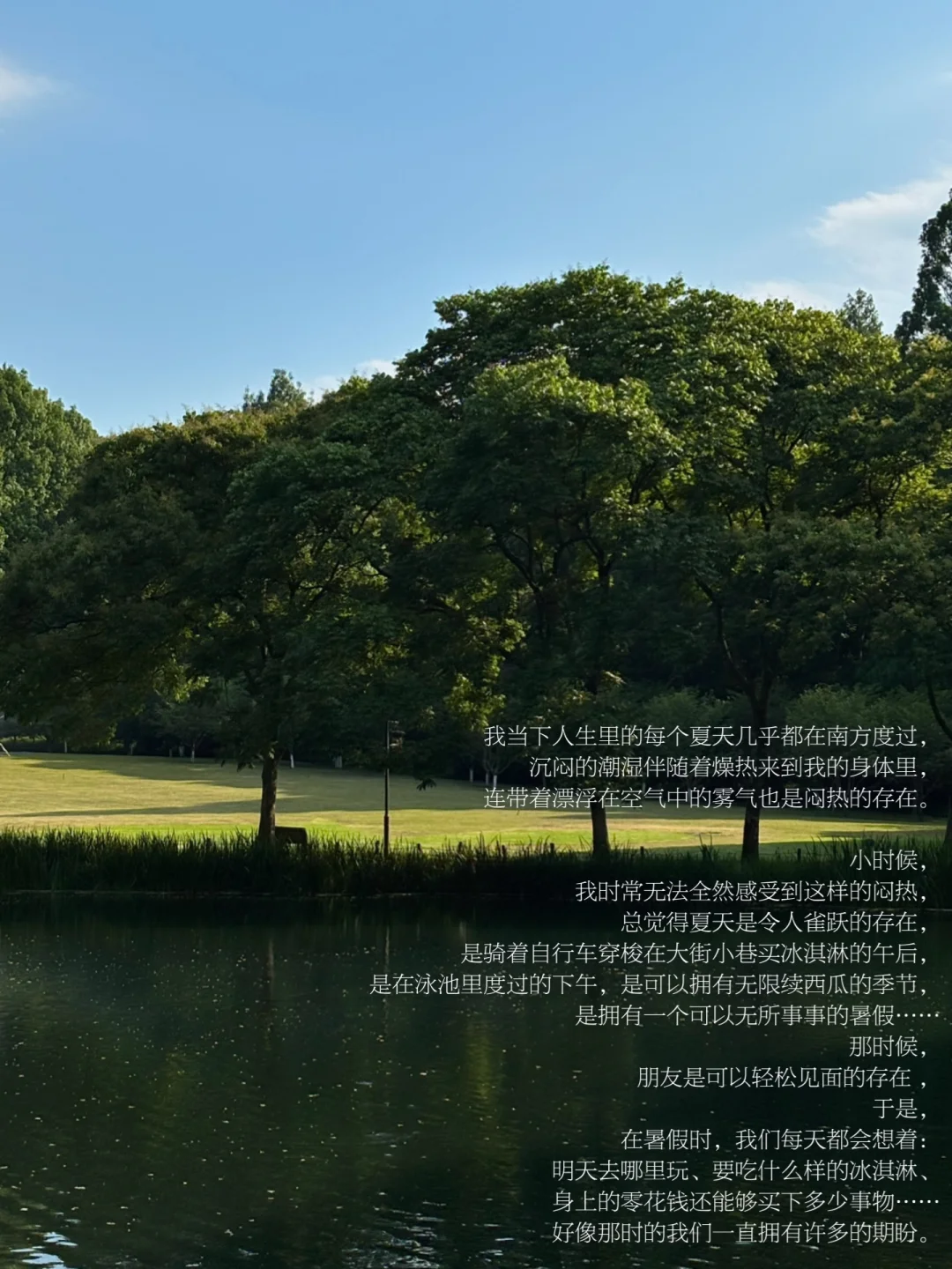 我人生里的每个夏天几乎都在南方度过,小时候,我时常无法感受到这样的闷热,总觉得夏天是令人雀跃的存在,是骑着自行车穿梭在大街小巷买冰淇淋的午后,是可以拥有无限续西瓜的季节,是拥有一个可以无所事事的暑假。那时候,朋友是可以轻松见面的存在 ,于是,在暑假时,我们每天都会想着:明天去哪里玩、要吃什么样的冰淇淋、身上的零花钱还能够买下多少事物,好像那时的我们一直拥有许多的期盼。