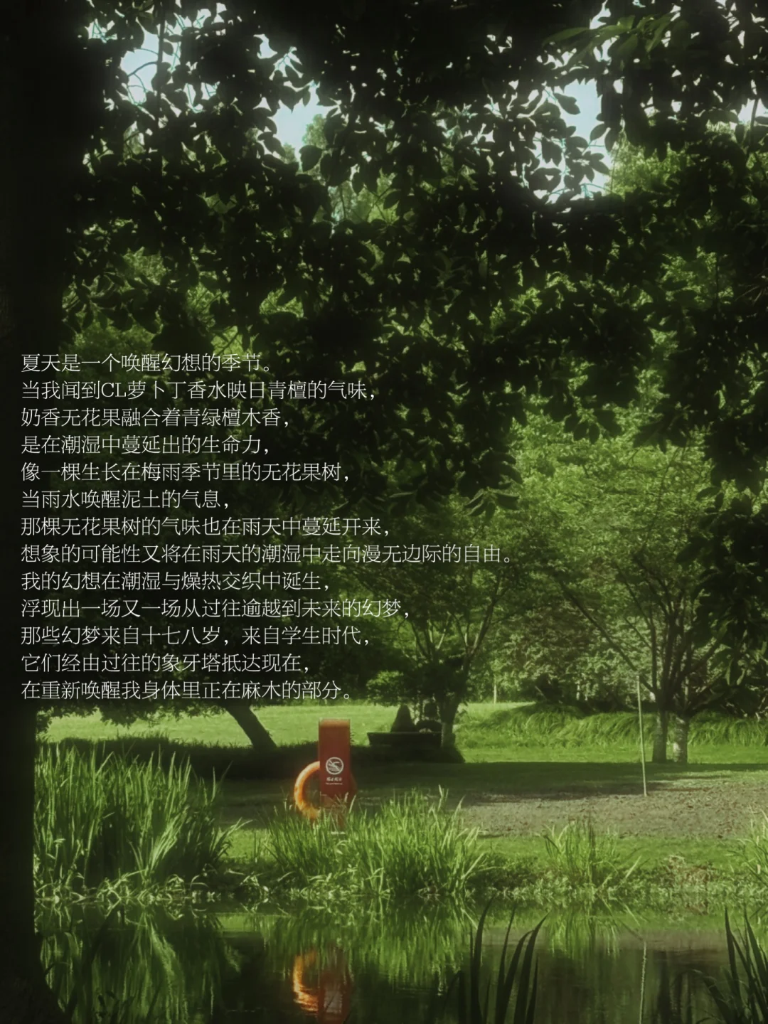 夏天是一个唤醒幻想的季节,当我闻到CL萝卜丁香水映日青檀的气味,奶欲无花果融合着青绿檀木香,是在潮湿中蔓延出的生命力,像一棵生长在梅雨季节里的无花果树,当雨水唤醒泥土的气息,那棵无花果树的气味也在雨天中蔓延开来,想象的可能性又将在雨天的潮湿中走向漫无边际的自由。我的幻想在潮湿与燥热交织中诞生,那些幻梦来自十七八岁,它们经由过往的象牙塔抵达现在。