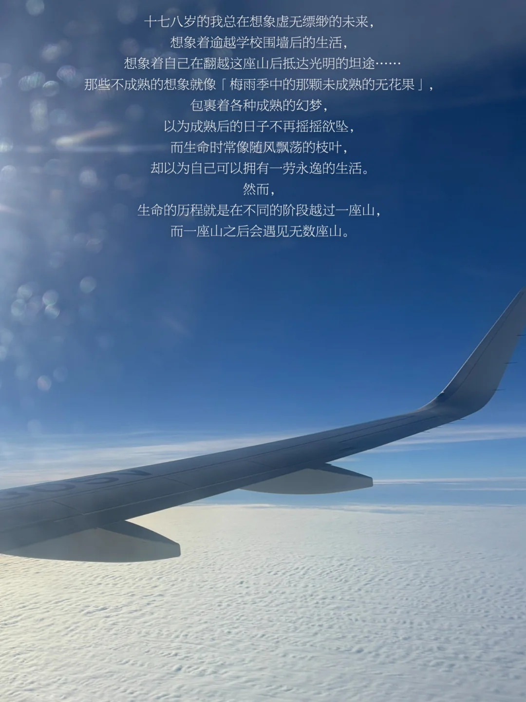 十七八岁的我总在想象虚无缥缈的未来,想象着逾越学校围墙后的生活,想象着自己在翻越这座山后抵达光明的坦途……那些不成熟的想象就像梅雨季中的那颗未成熟的无花果,包裹着各种成熟的幻梦,以为成熟后的日子不再摇摇欲坠,然而生命时常像随风飘荡的枝叶,却以为自己可以拥有一劳永逸的生活。而生命的历程就是在不同的阶段越过一座山后仍会遇见无数座山。