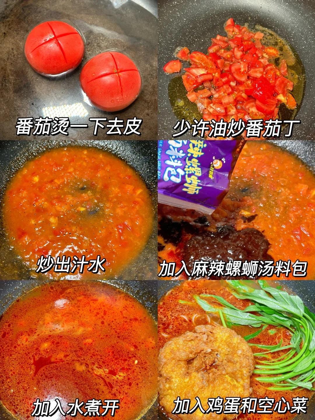 2️⃣番茄切成丁,锅里加少许油,把番茄炒出汁水来,加入,麻辣螺蛳粉汤料包,加水煮开,然后加入炸蛋和空心菜,空心菜烫软后出锅