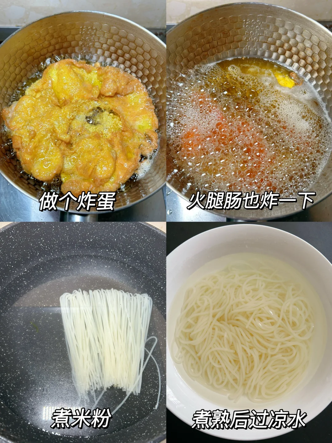 1️⃣做个炸蛋,火腿肠切片也炸一下。番茄划十字到,在开水里烫一下去皮。干米粉煮熟,过一下凉水更q弹