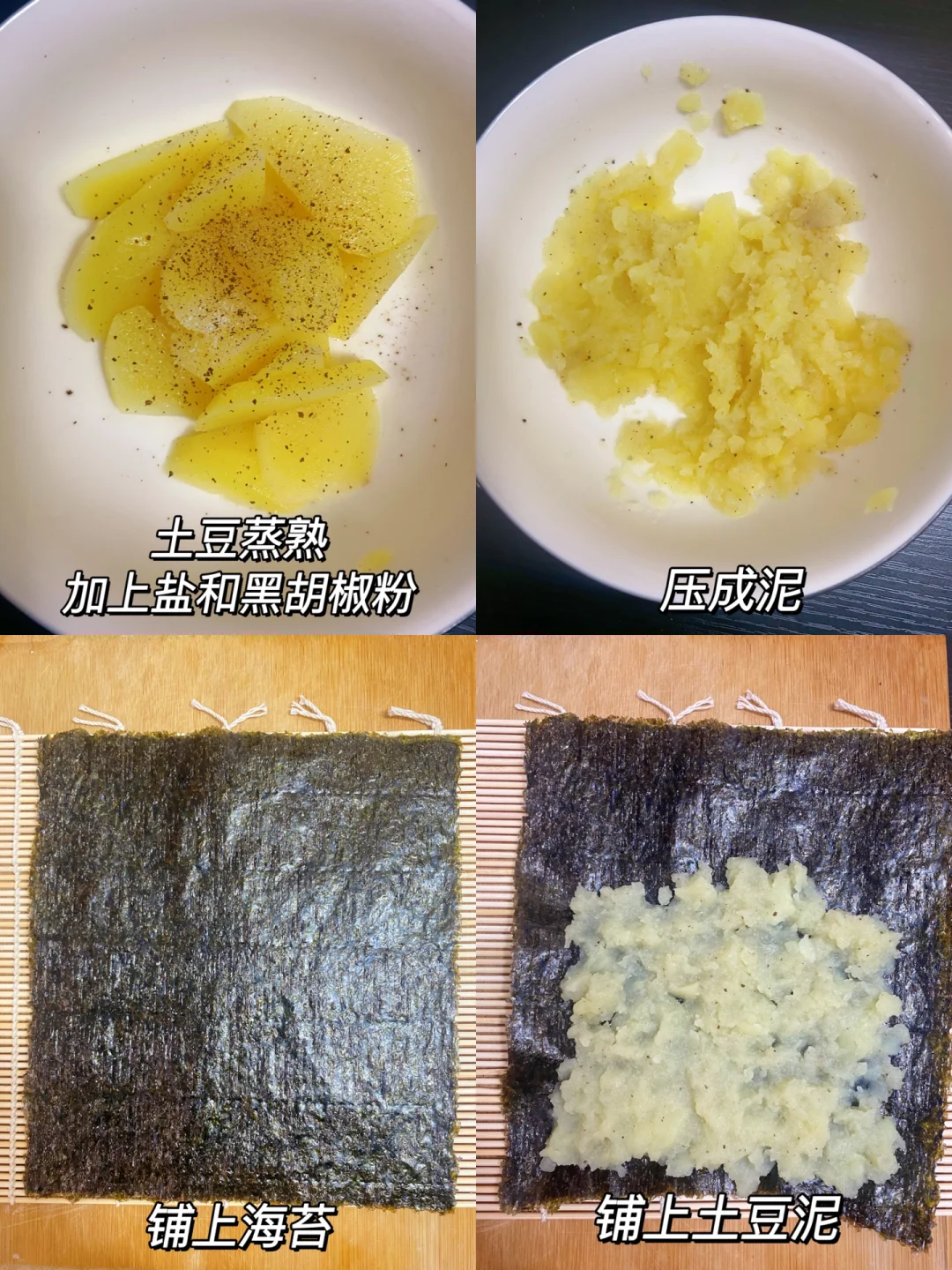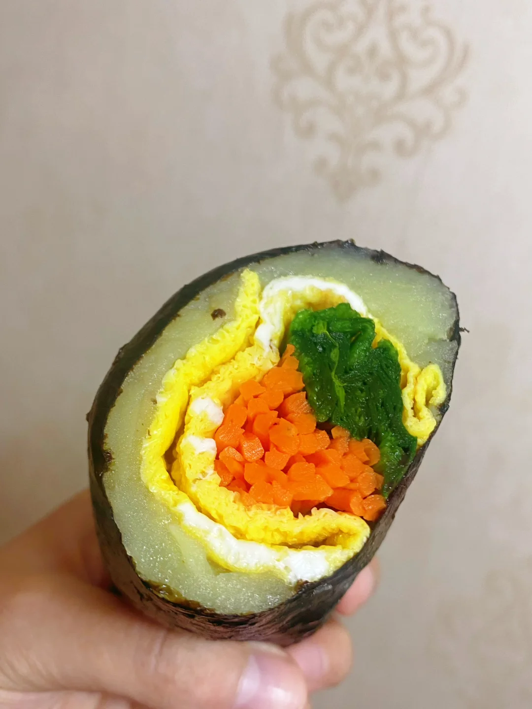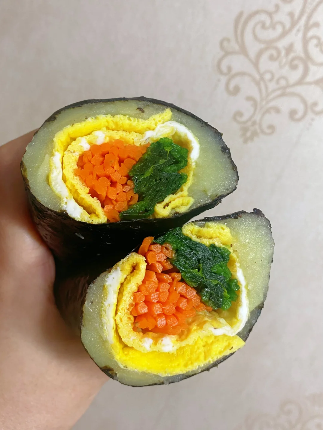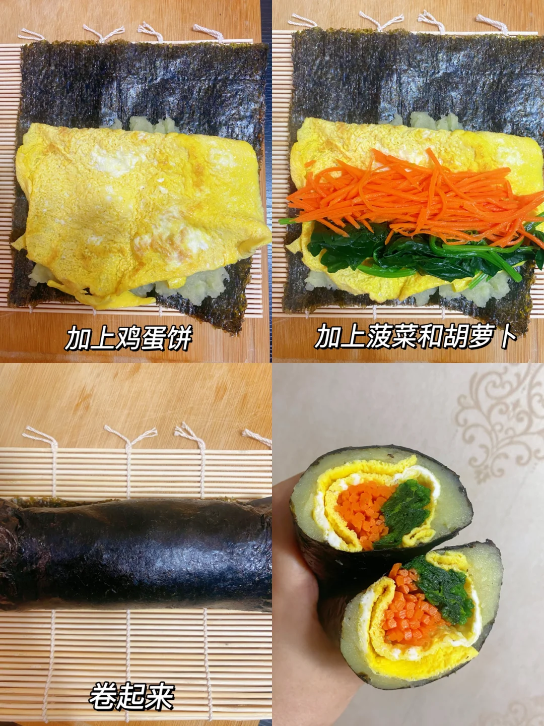 饱腹又好吃! 做法也简单! 1⃣️鸡蛋打散煎成蛋饼,胡萝卜和菠菜焯水备用,土豆切成块上锅蒸熟,加入盐和黑胡椒粉压成泥 2⃣️海苔上铺一层土豆泥,再加入蛋饼,再加入菠菜和胡萝卜,卷起来 完成✅ 减肥版寿司🍣 真的太🉑️了!!