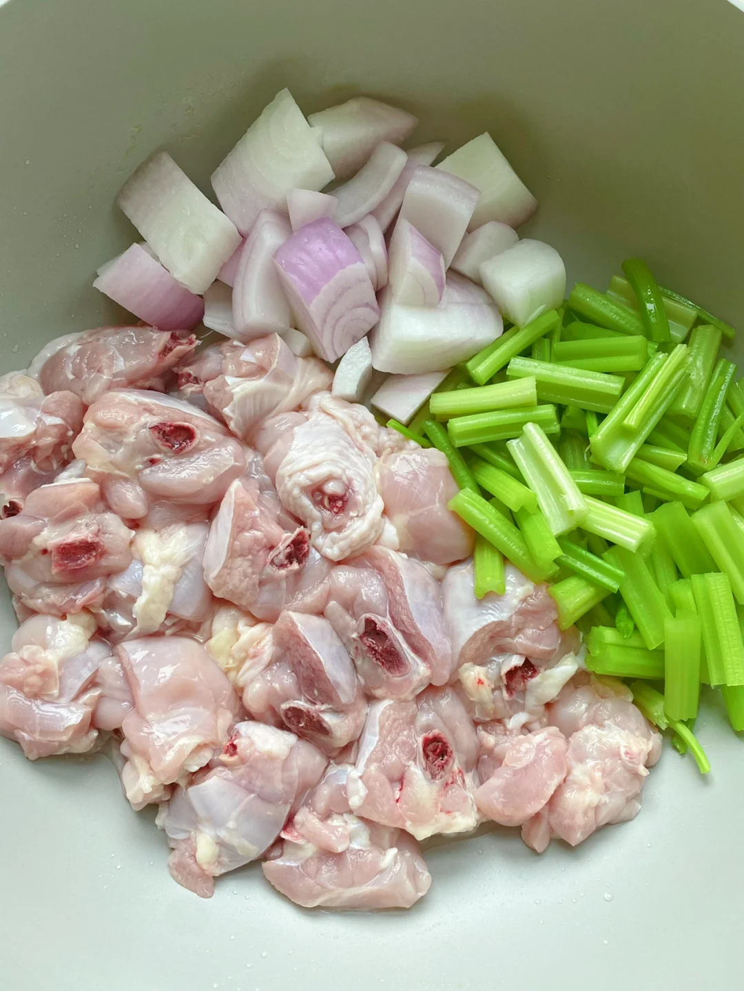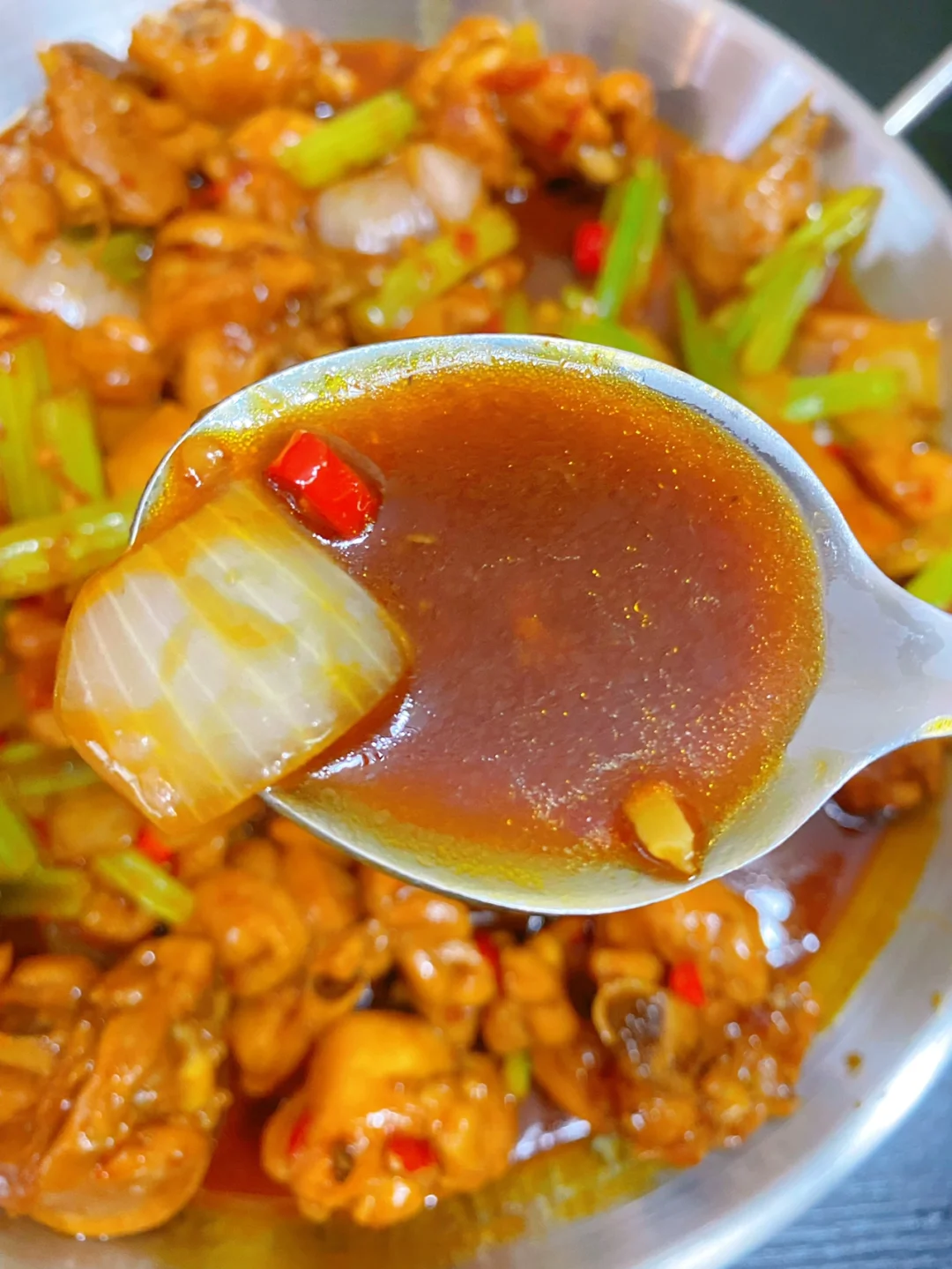 太下饭了!! 跟外面的一样!! 1⃣️鸡腿肉冷水泡半个小时去掉血水,加入生抽、料酒、黑胡椒粉抓匀腌制10分钟 2⃣️准备姜片、蒜片和酱汁。酱汁比例:1勺豆瓣酱、1勺黄豆酱、1勺老抽、1勺生抽、1勺蚝油拌匀 3⃣️准备荷叶不粘锅,锅里放油炒鸡腿肉,把水分炒干之后加入蒜片、姜片,炒至鸡腿微焦,加入酱汁翻炒均匀,倒入一罐啤酒,加入盐和冰糖,盖上盖子小火焖15分钟。收汁差不多之后加入洋葱和芹菜继续焖煮5分钟,撒上小米辣出锅 完成✅ 哇!! 真的太香啦!! 就是那个味儿!! 汤汁浇在米饭上更绝!!