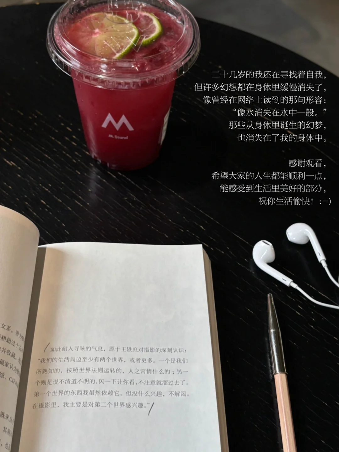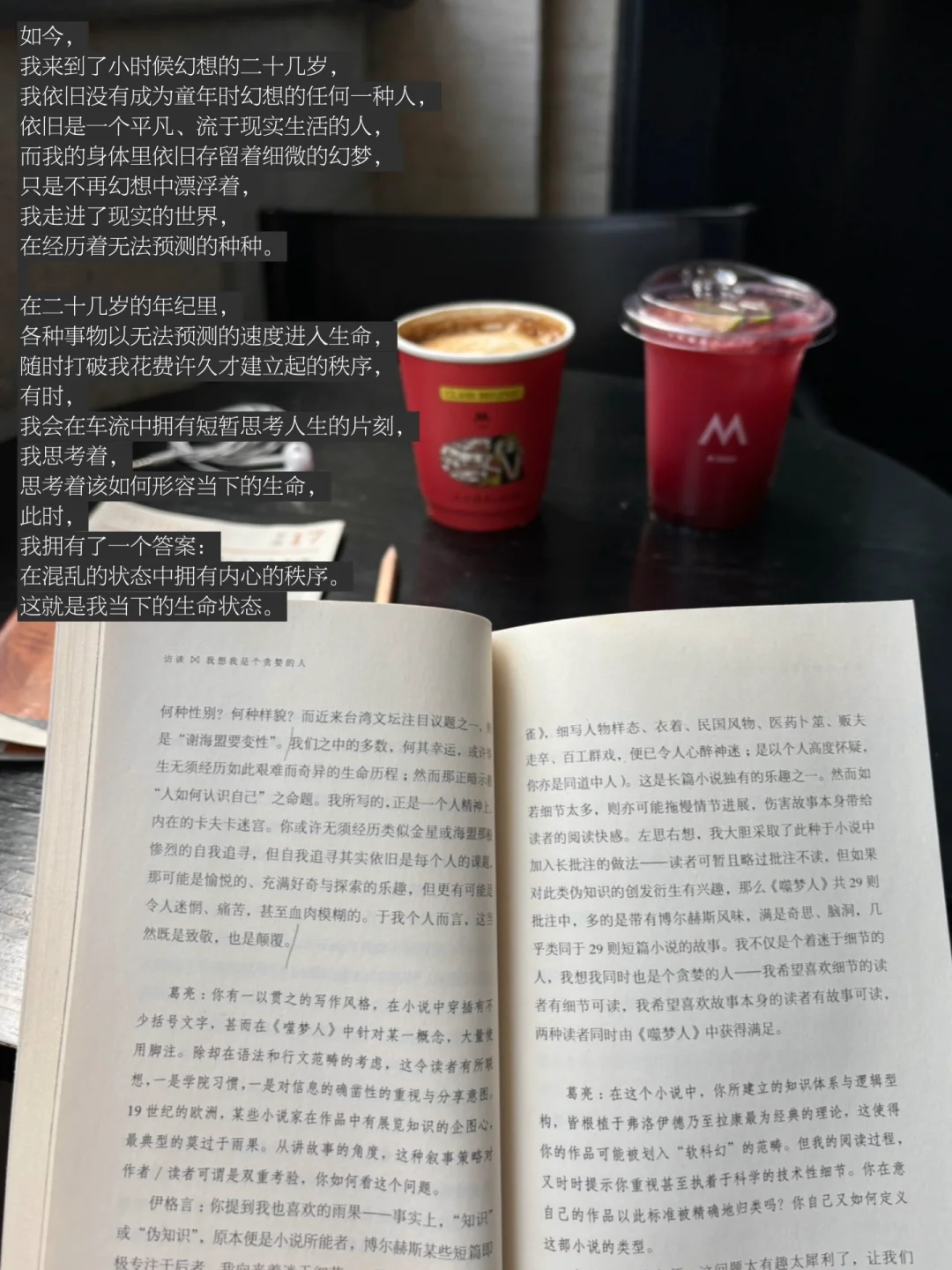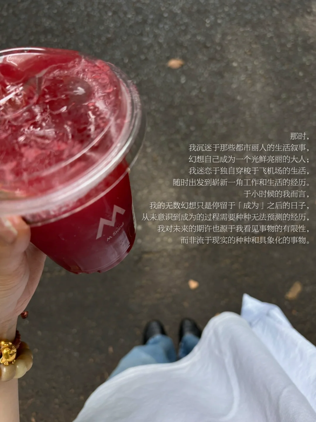 如今,我来到了小时候幻想的二十几岁,我依旧没有成为童年时幻想的任何一种人,依旧是一个平凡、流于现实生活的人,而我的身体里依旧存留着细微的幻梦, 只是不再幻想中浮着,我走进了现实的世界,在经历着无法预测的种种。二十几岁的我还在寻找着自我,但许多幻想都在身体里缓慢消失了,像曾经在网络上读到的那句形容:“像水消失在水中一般。”那些从身体里诞生的幻梦,也消失在了我的身体中。