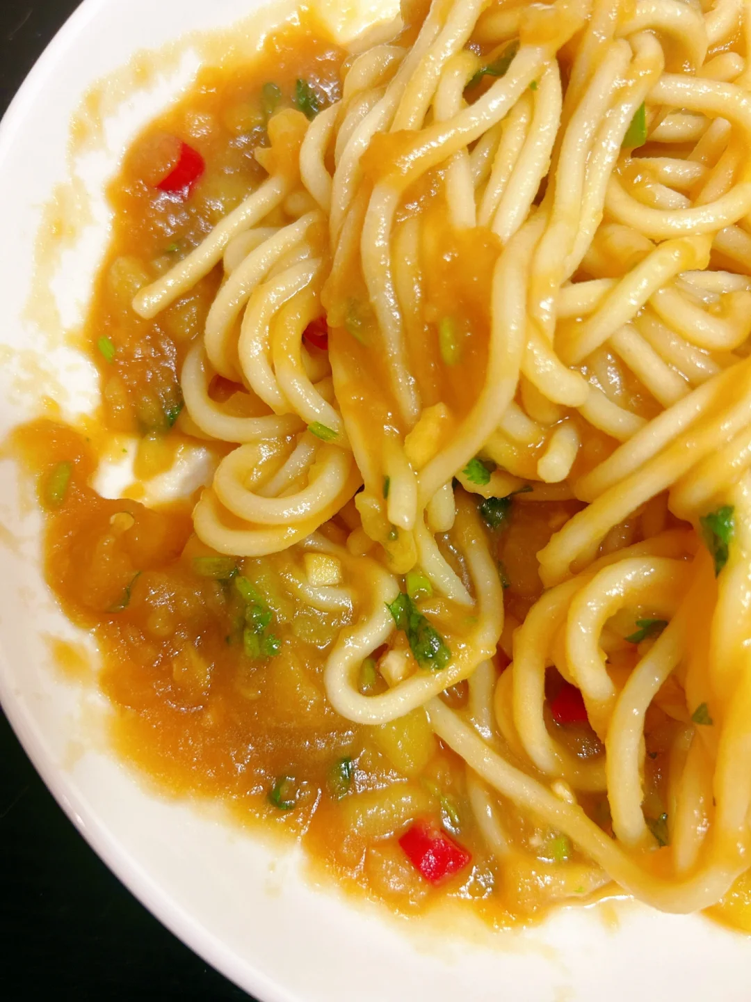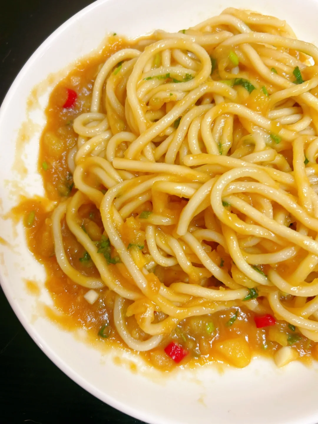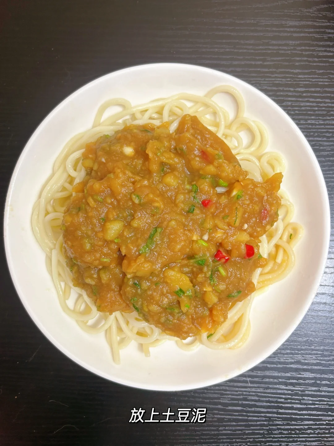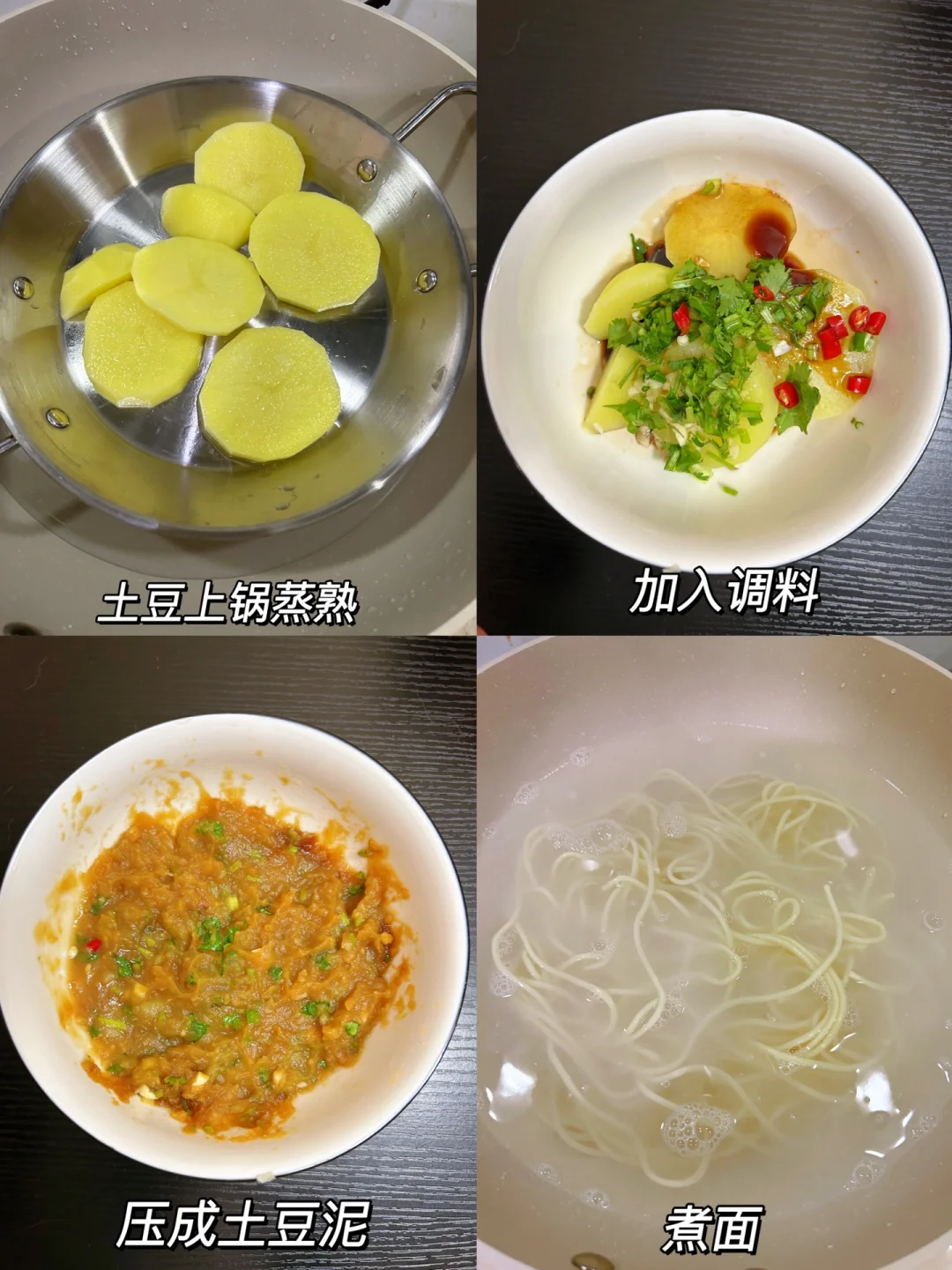 土豆泥拌面绝了!! 黏黏糊糊 太好吃了啊!!! 1⃣️土豆切片上锅蒸熟,加入蒜末、葱花、香菜、1勺生抽、1勺蚝油、1勺醋、1勺盐、1勺鸡精,压成土豆泥 2⃣️煮面,煮熟之后过一次凉水装盘,土豆泥浇在上面,拌匀 完成✅ 太好吃啦!! 超级满足!!