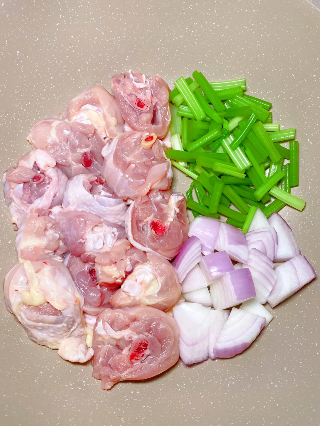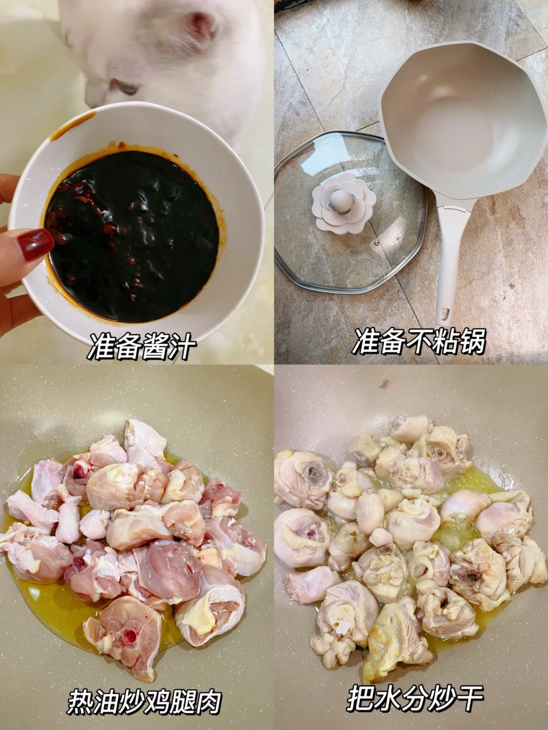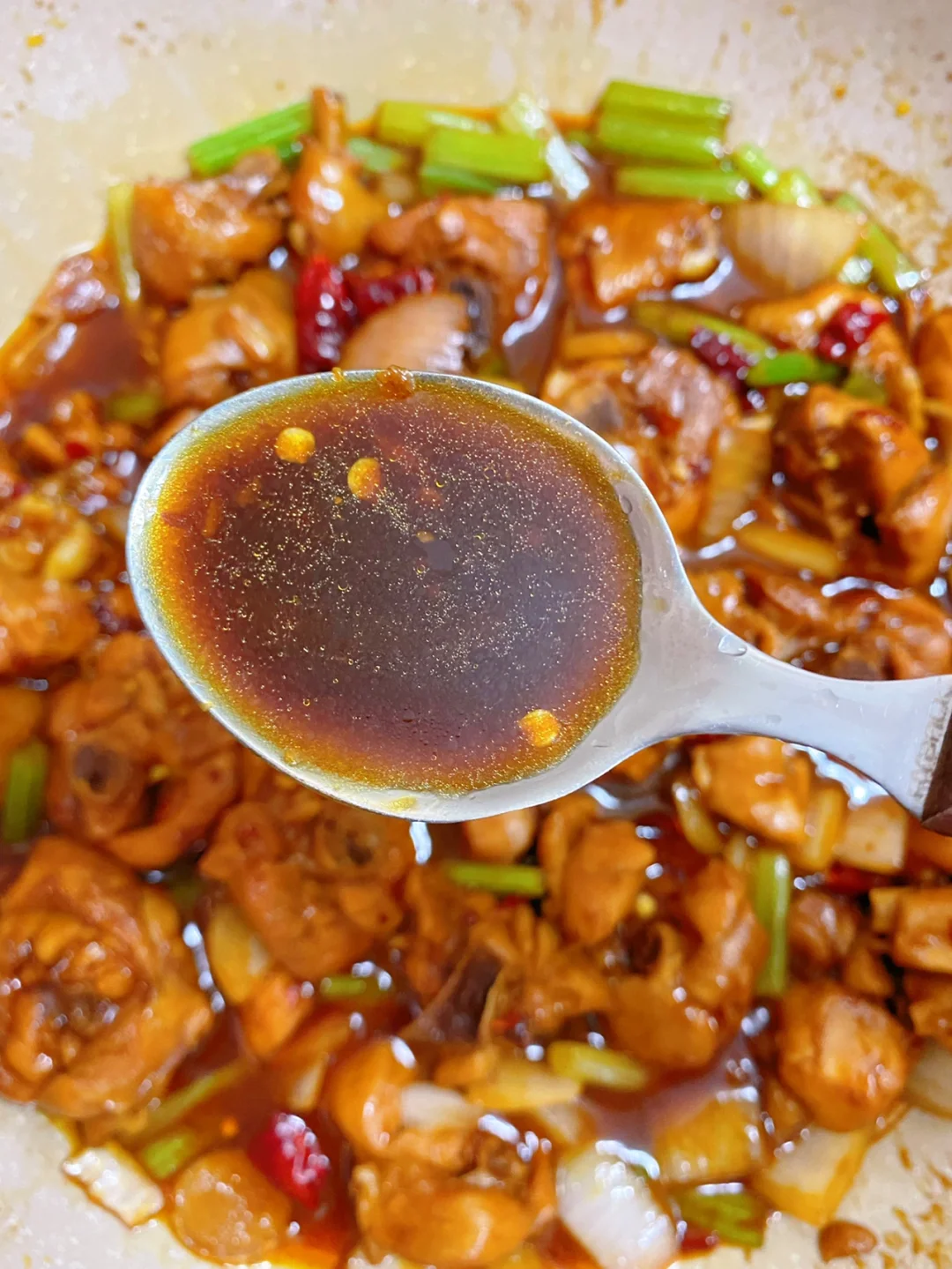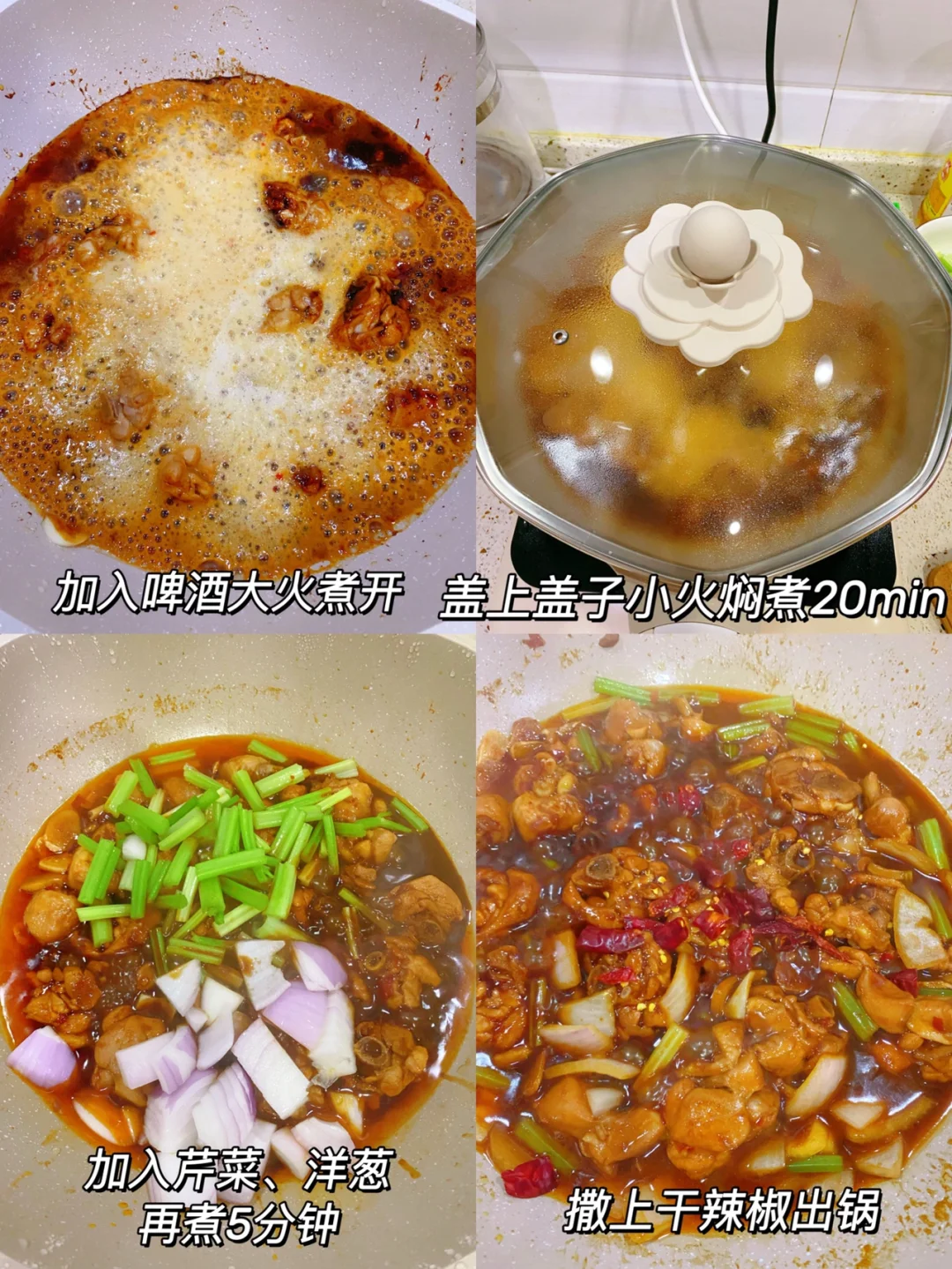 在家做出来的简易版鸡公煲 太好吃啦!多吃好几碗饭!! 1⃣️准备酱汁和繁花烙的山茶花不粘锅,酱汁比例:1勺黄豆酱、1勺豆瓣酱、1勺蚝油、1勺生抽、1勺老抽 2⃣️热油炒鸡腿肉,把水分炒干。加入姜、蒜翻炒至微焦,倒入刚刚的酱汁,再加冰糖、盐炒匀 3⃣️倒入一罐啤酒,大火烧开之后,盖上盖子转小火焖煮20分钟,再加入芹菜、洋葱继续煮5分钟,最后撒上干辣椒出锅 完成✅ 哇哦!!! 真的太香啦!!