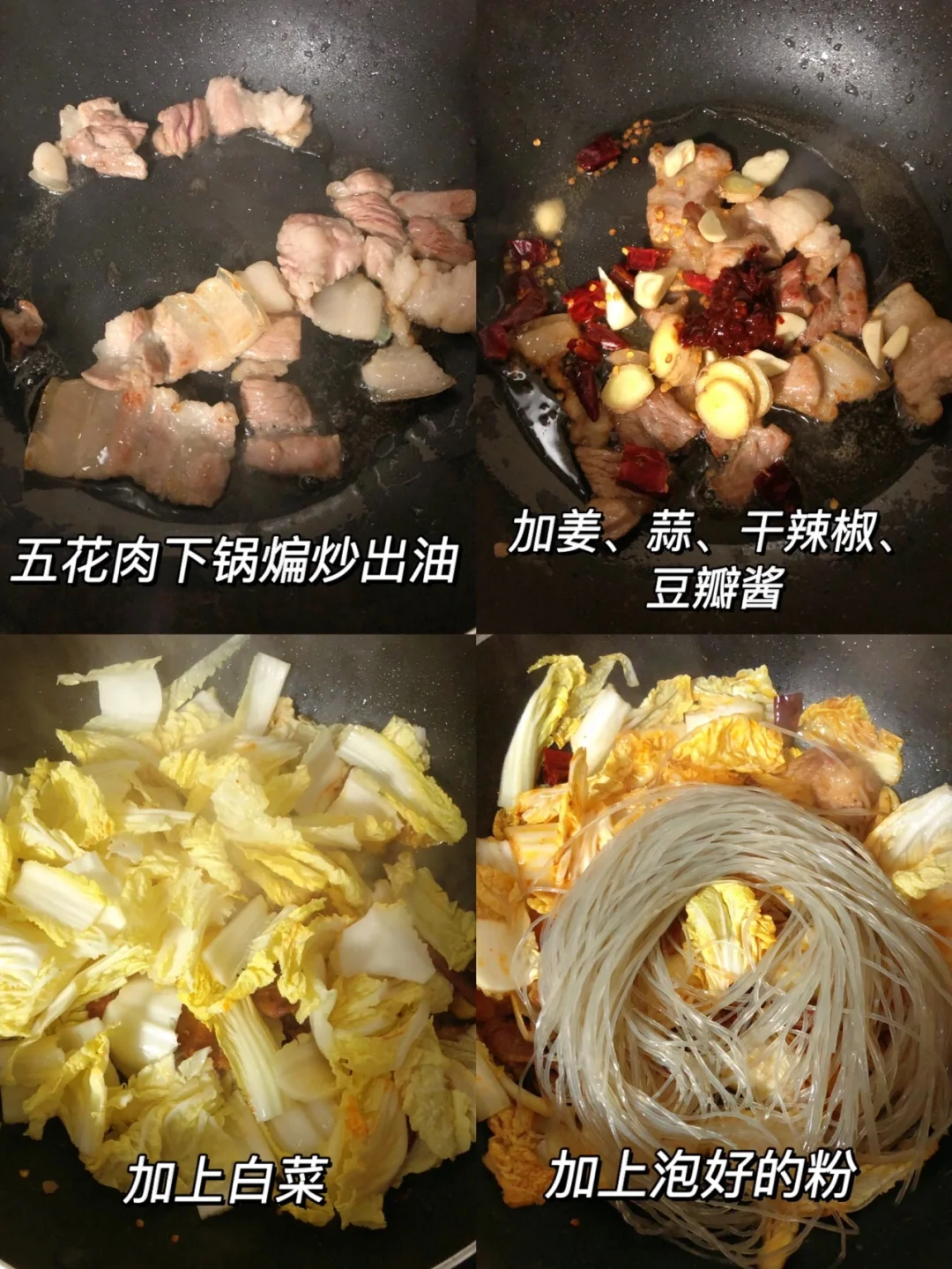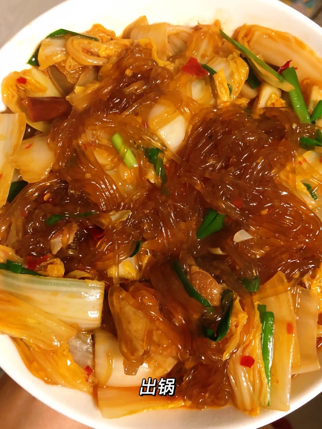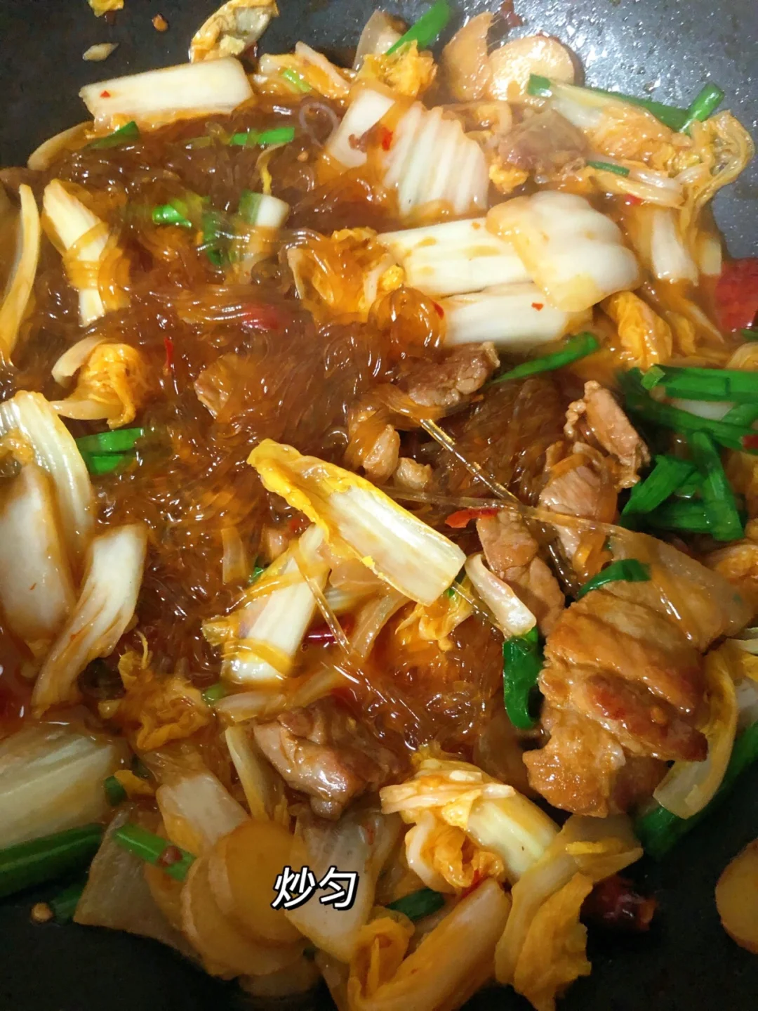 好吃又下饭!! 真的🉑️!! 1⃣️提前用热水泡一个小时红薯粉条 2⃣️直接下锅炒五花肉煸炒出油,再加姜、蒜、干辣椒和豆瓣酱炒匀,再加入白菜和粉条 3⃣️加盐、鸡精、生抽炒匀,加开水小火炖煮10分钟,最后撒上韭菜出锅 完成✅ 怎么能这么好吃!! 直接当主食吃我也可以!!!