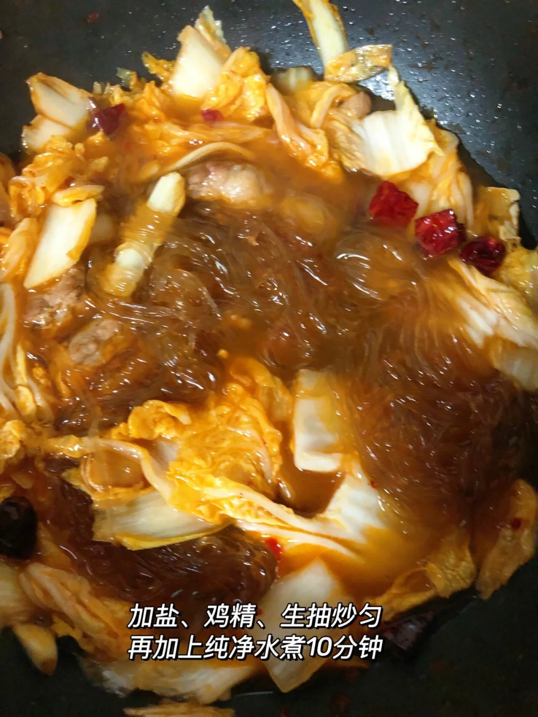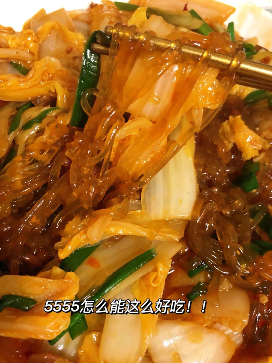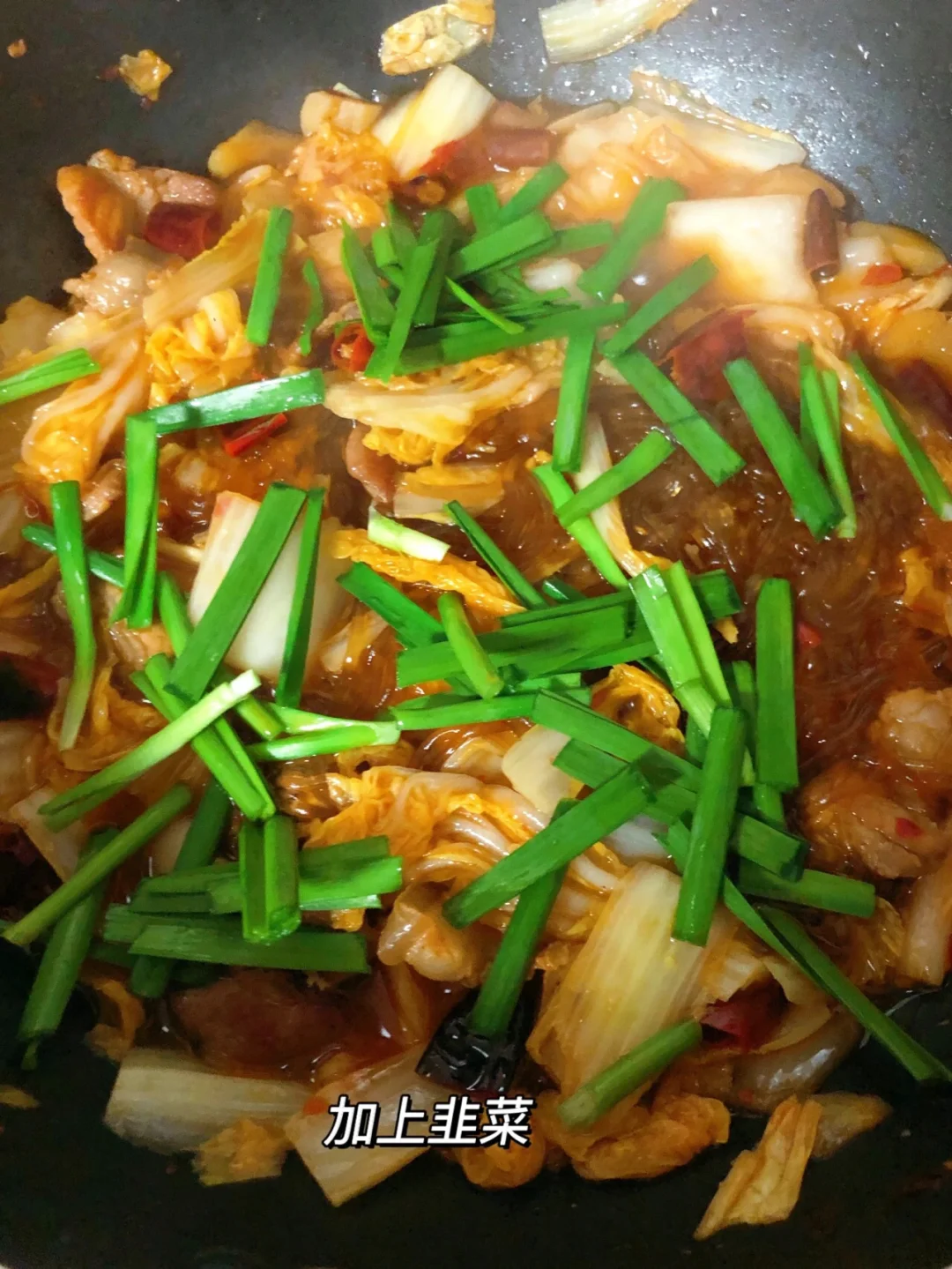 好吃又下饭!! 真的🉑️!! 1⃣️提前用热水泡一个小时红薯粉条 2⃣️直接下锅炒五花肉煸炒出油,再加姜、蒜、干辣椒和豆瓣酱炒匀,再加入白菜和粉条 3⃣️加盐、鸡精、生抽炒匀,加开水小火炖煮10分钟,最后撒上韭菜出锅 完成✅ 怎么能这么好吃!! 直接当主食吃我也可以!!!