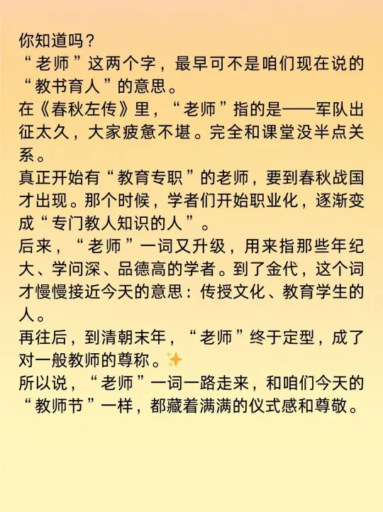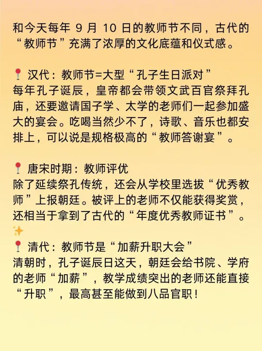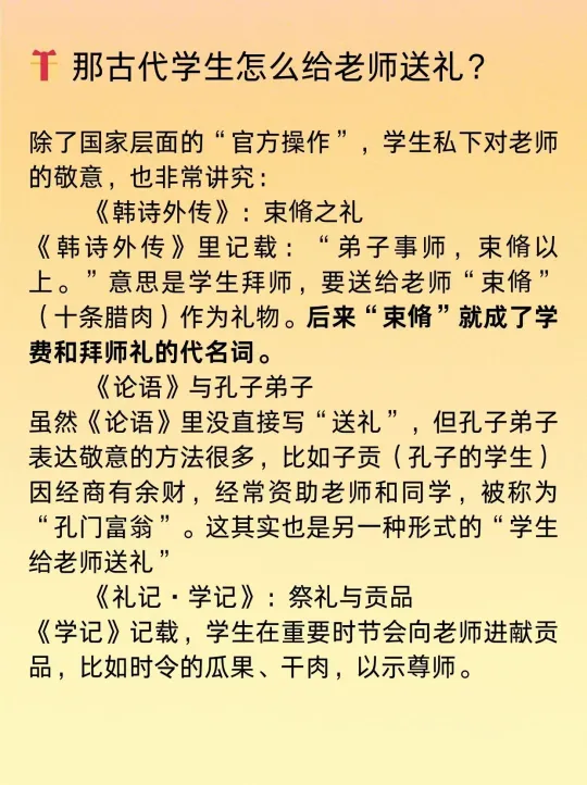 人大刚子祝大家教师节快乐 要说教师节,先得敲黑板: 小编标题党啦!!! “古代没有全国法定教师节!” 但“尊师”这件事,他们比我们还认真~ 1️⃣ 国家篇·祭孔=“最高规格” 从汉到清,每年春秋二仲月的“释奠礼”是雷打不动的国家大典。皇帝(或地方长官)率百官进孔庙、上香、献爵,太学、府学老师也能蹭到站位,相当于官方给教育界集体“打call”。不过注意:这是尊孔,不是给所有老师过节。 2️⃣ 职场篇·“评职称”偶尔有 唐宋起,对教官考核优异者可升官、赐帛;清代山长若课士有方,确实能擢为八品学录。但属于“随机掉落”,一年未必摊上一回,。 3️⃣ 学生篇·见面礼“硬通货” 孔子时代已收“束脩”——十条腊肉。明清换成交“脩金”(银两),富贵弟子还会再送节令瓜果、文具,相当于今天的“学费+心意礼包”。 4️⃣ 文艺篇·“精神红包” 明清学子流行把谢师话写进诗、刻成匾,真手写贺卡。 5️⃣ 日常篇·三节两寿 民间私塾里,端午、中秋、春节及老师生日、孔子生日,学生常上门“问安+送礼”,这才是“古代版教师节仪式感”的真正来源——私仪,非法定。 所以,无论腊肉、银两还是诗词,古人都在用郑重方式说同一句: “老师,您辛苦了!” 今天的一束花、一张贺卡,不过是把千年传统换了包装~