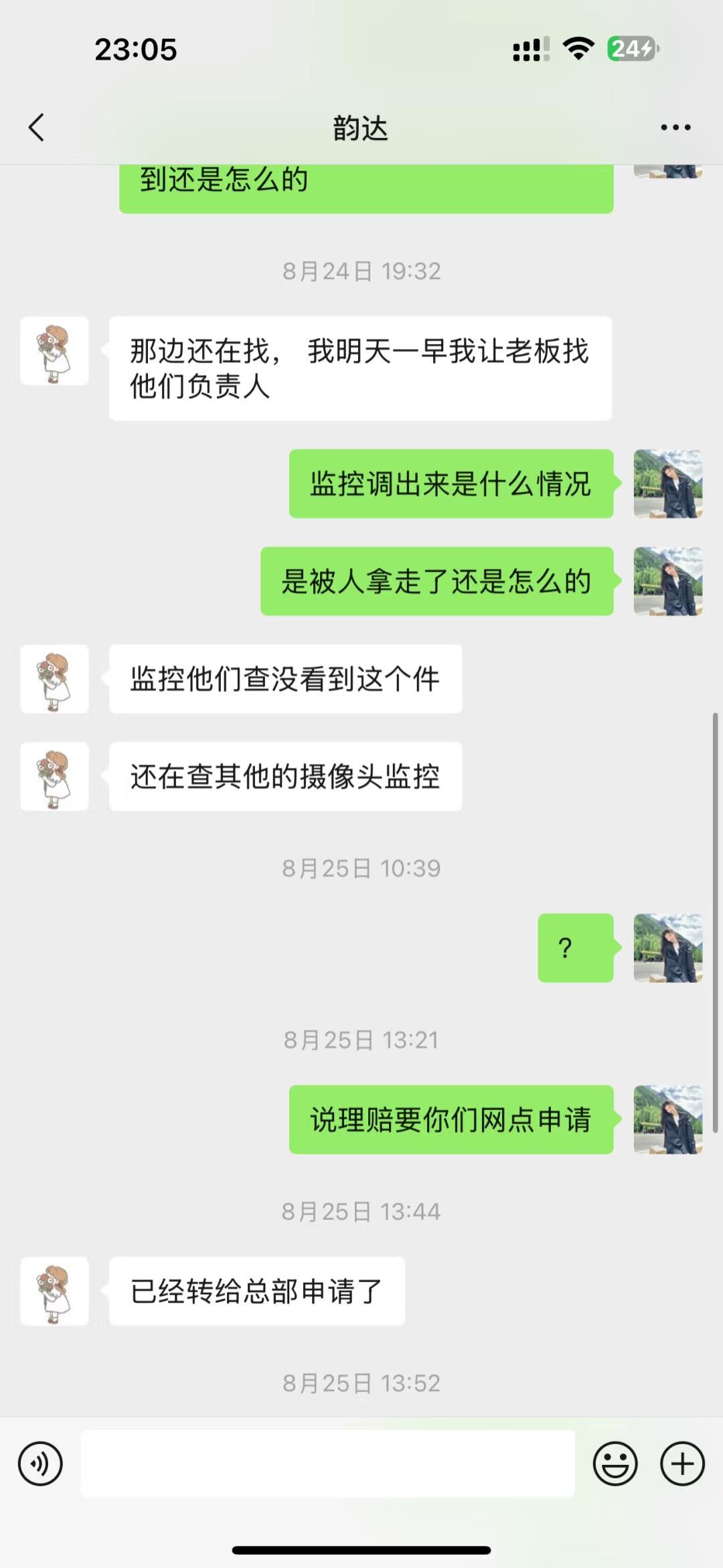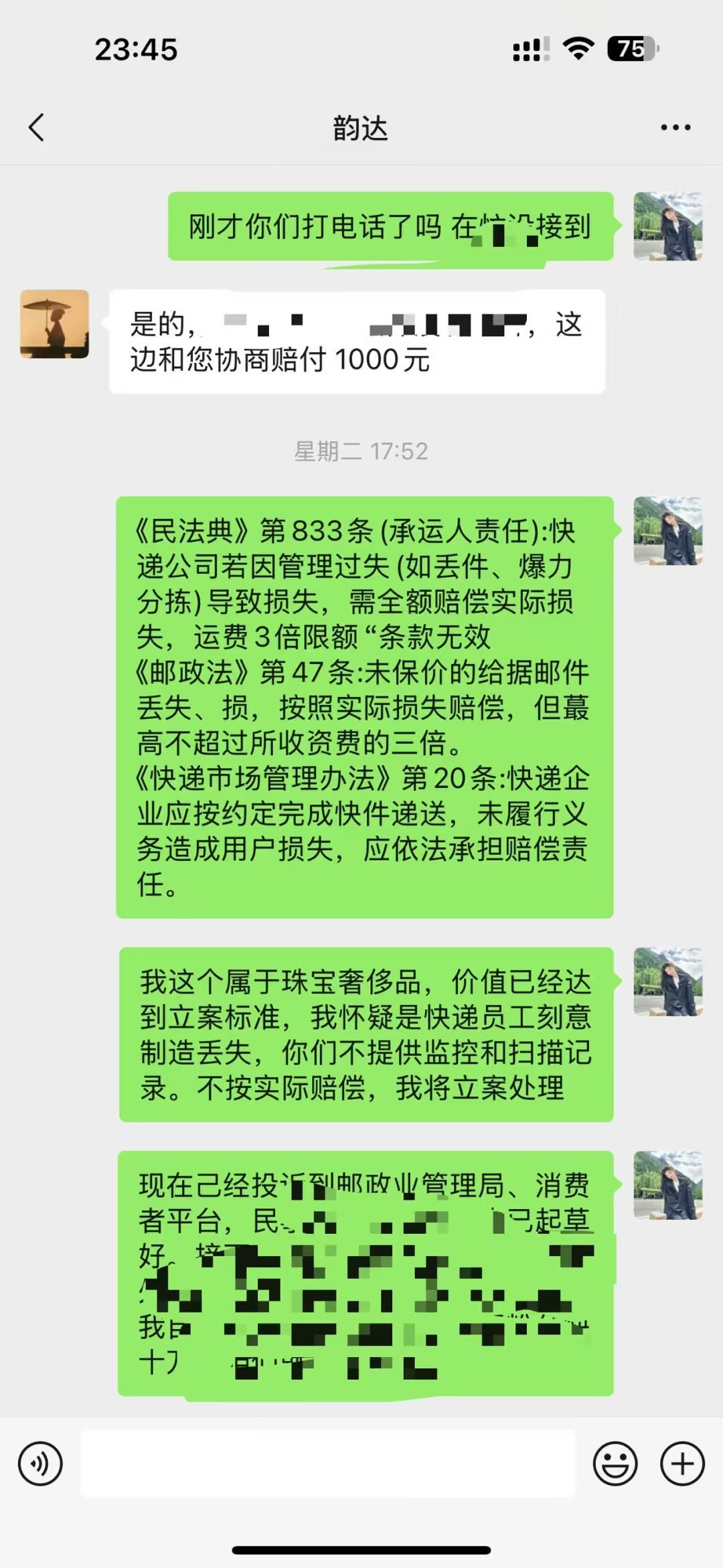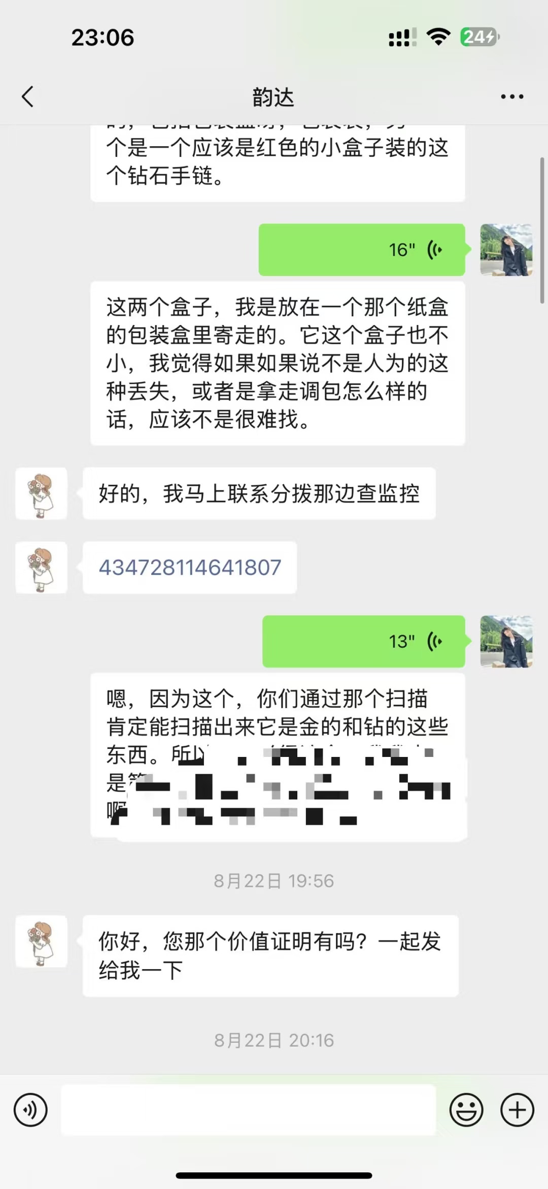 8.15。2.运费并非是28元。3.韵达“快件运输条例”我并未签署,与菜鸟签署合同中无此项,霸王合同不生效。4.快递在运输之前的扫描是知情内容物的,对方拒绝提供扫描记录及运输监控。实际材质是普通饰品还是真金奢侈品、你们的扫描记录便可证明。5.如果真是普通饰品,对方怎么会上来就和我协商1000的赔偿?和你们举报材料写的140也不符呀?颠倒黑白地掩饰过错真是够下三滥的,这是你们的企业文化???
