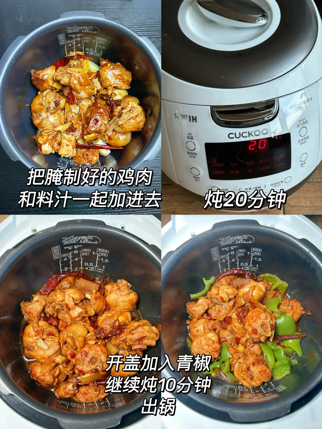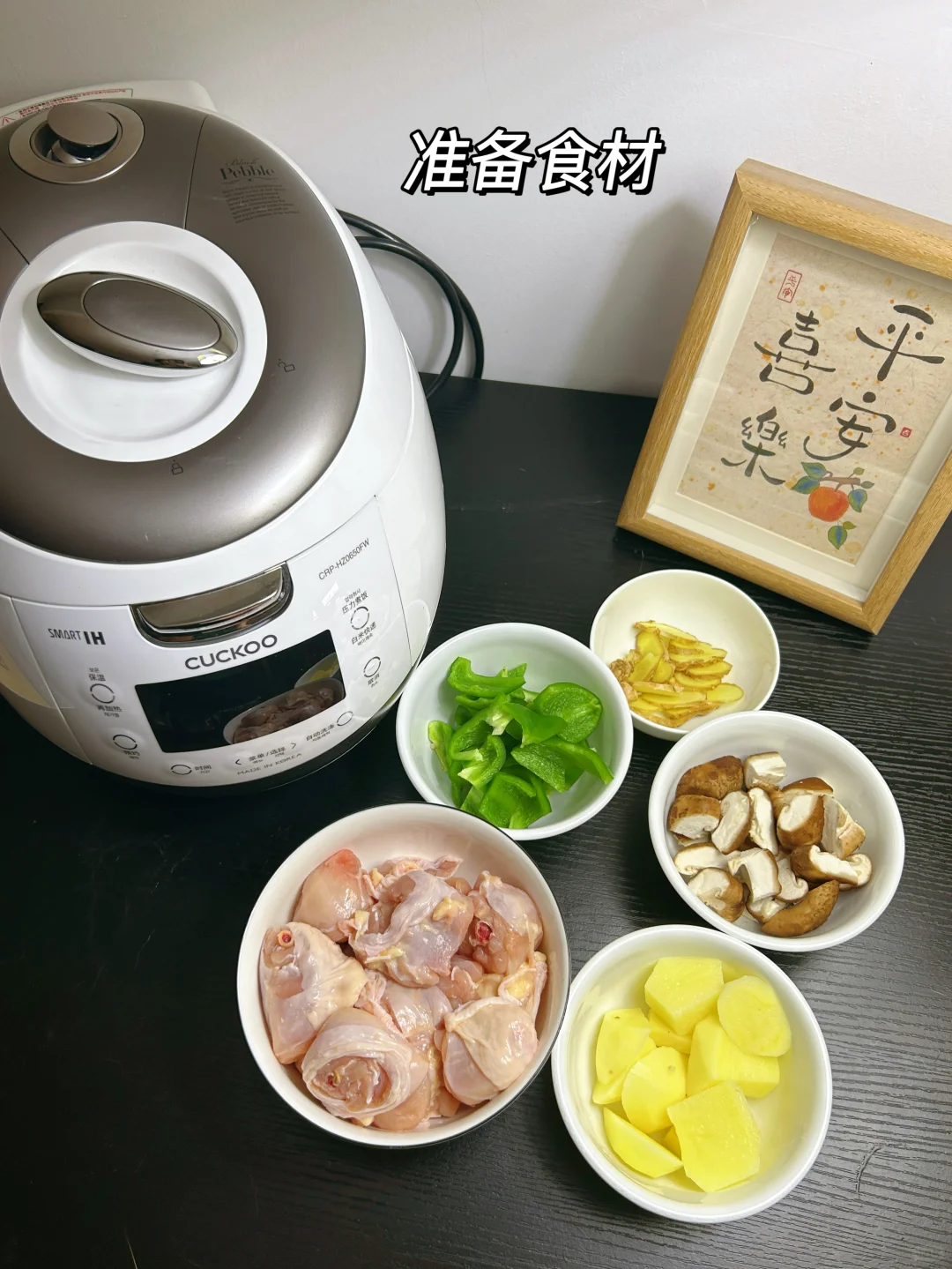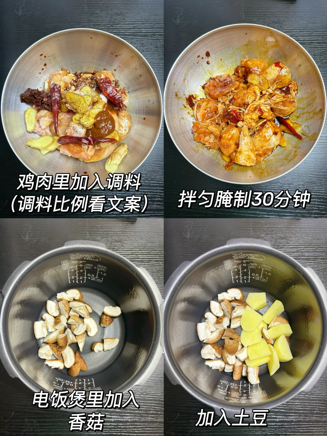 3️⃣电饭煲里铺上一层土豆,一层香菇,铺上腌制好的鸡肉和料汁,按煮饭键,开盖后加入青椒,继续炖10分钟出锅。