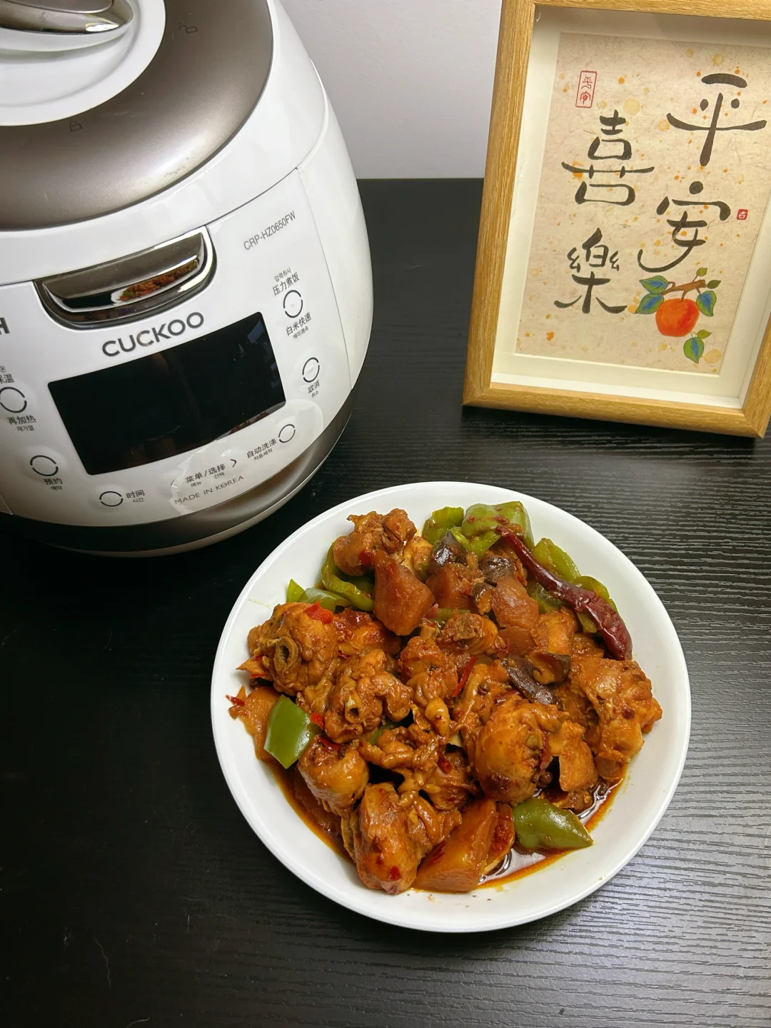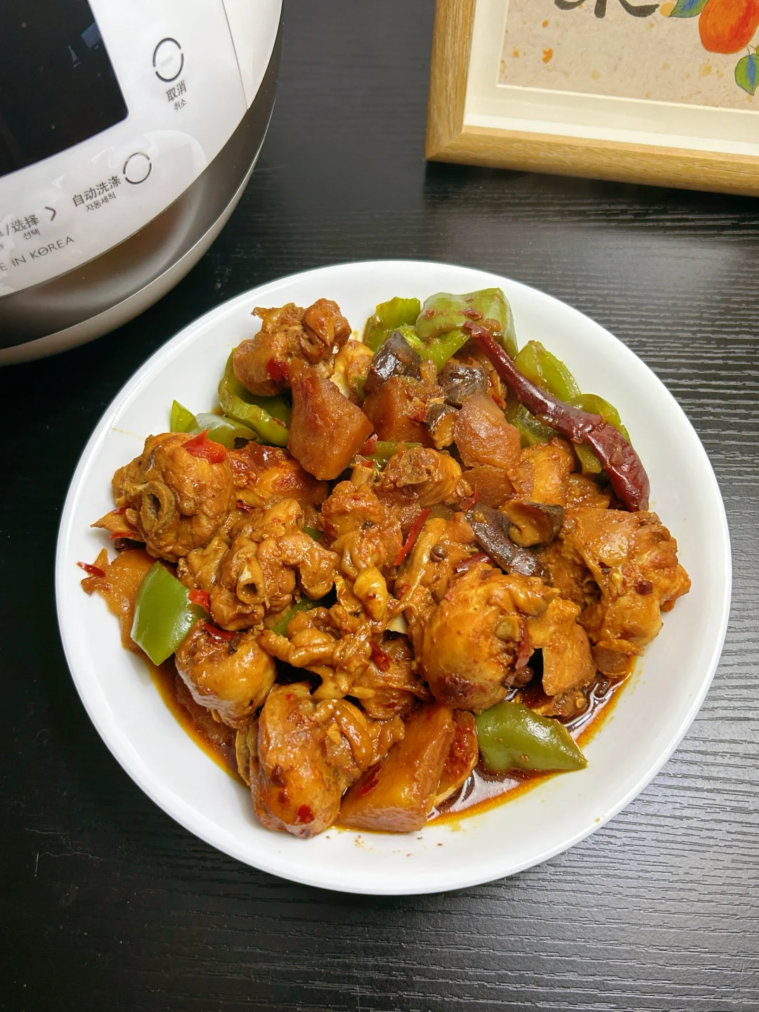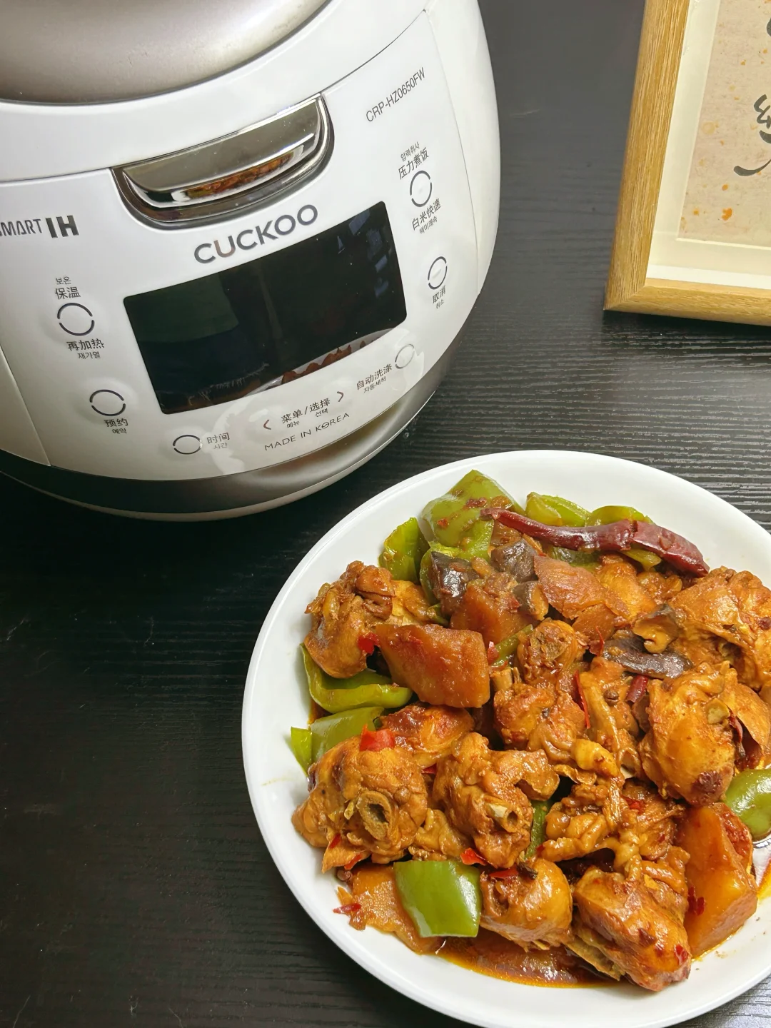 3️⃣电饭煲里铺上一层土豆,一层香菇,铺上腌制好的鸡肉和料汁,按煮饭键,开盖后加入青椒,继续炖10分钟出锅。