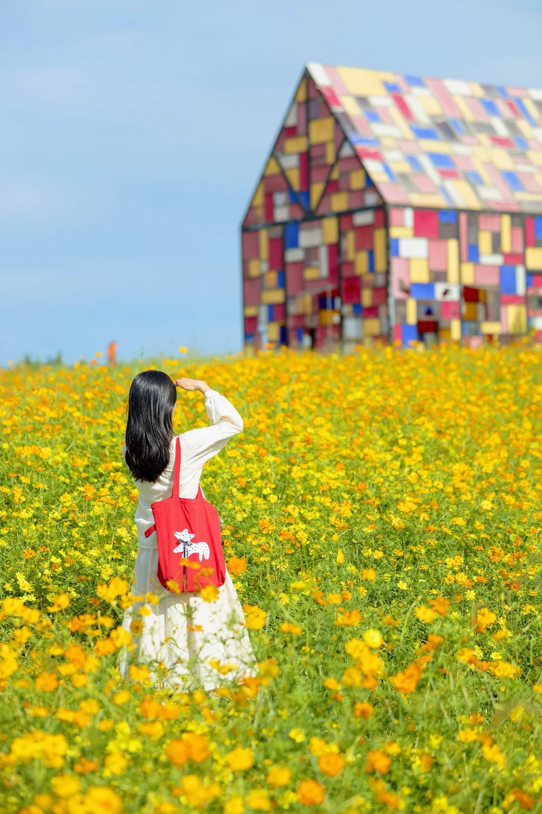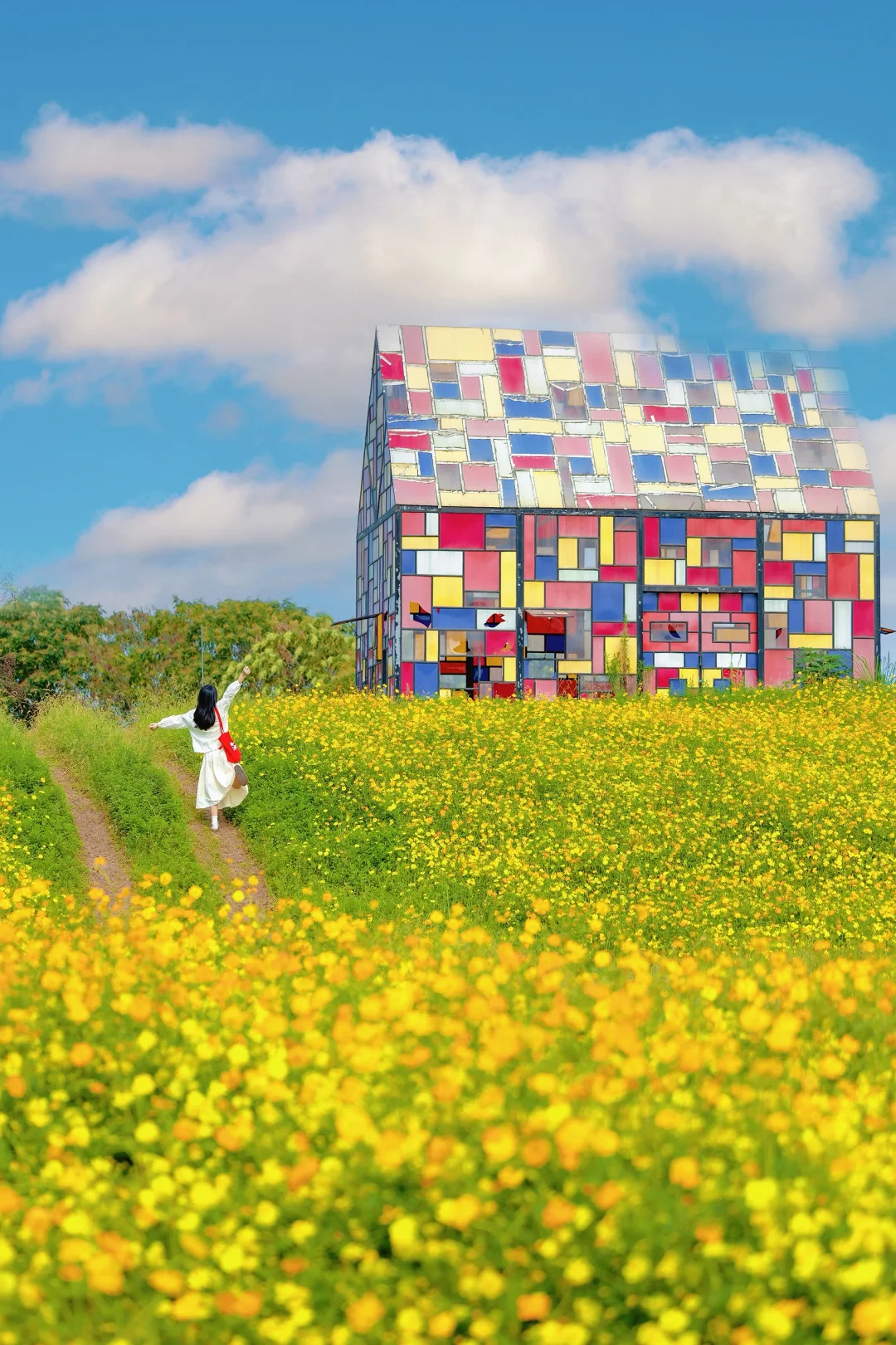 ✅走向小房子,蓝天白云加上花海,真的好像油画一样