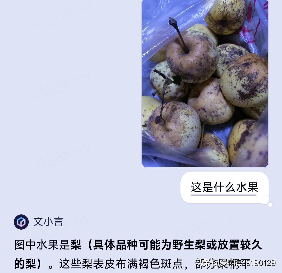 大家来看看这是啥水果。 昨天先生下班回家,提回来一袋水果,我看了一眼就有点不乐意,本来我就不太喜欢吃梨,这“梨”还长的满是黑斑、裂纹。 没想到他说是苹果,搞笑的吧,我见过的苹果多啦,第一次见这样的苹果,再仔细看看,外形确实有点像苹果,可是从颜色上看,怎么看怎么像梨。 他笑着洗了一个,削去果皮递给我让我尝尝。还真是苹果,而且还是我喜欢的那种类型,清脆爽口、酸甜适中。 他说他买之前也没看中,觉得比较好奇就问了一下,结果卖苹果的削了一块让他尝尝,他尝了一下正是我喜欢的类型,所以就买了一些。 晚上的时候,我拿它考验一下人工智能吧,人工智能果然也不比我见多识广,也是一口咬定它就是梨。 现代的种植技术让不少水果从外形到口感都有了很大的改变,让人都有点傻傻分不清了!