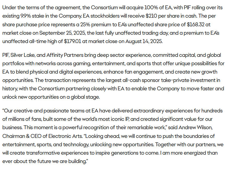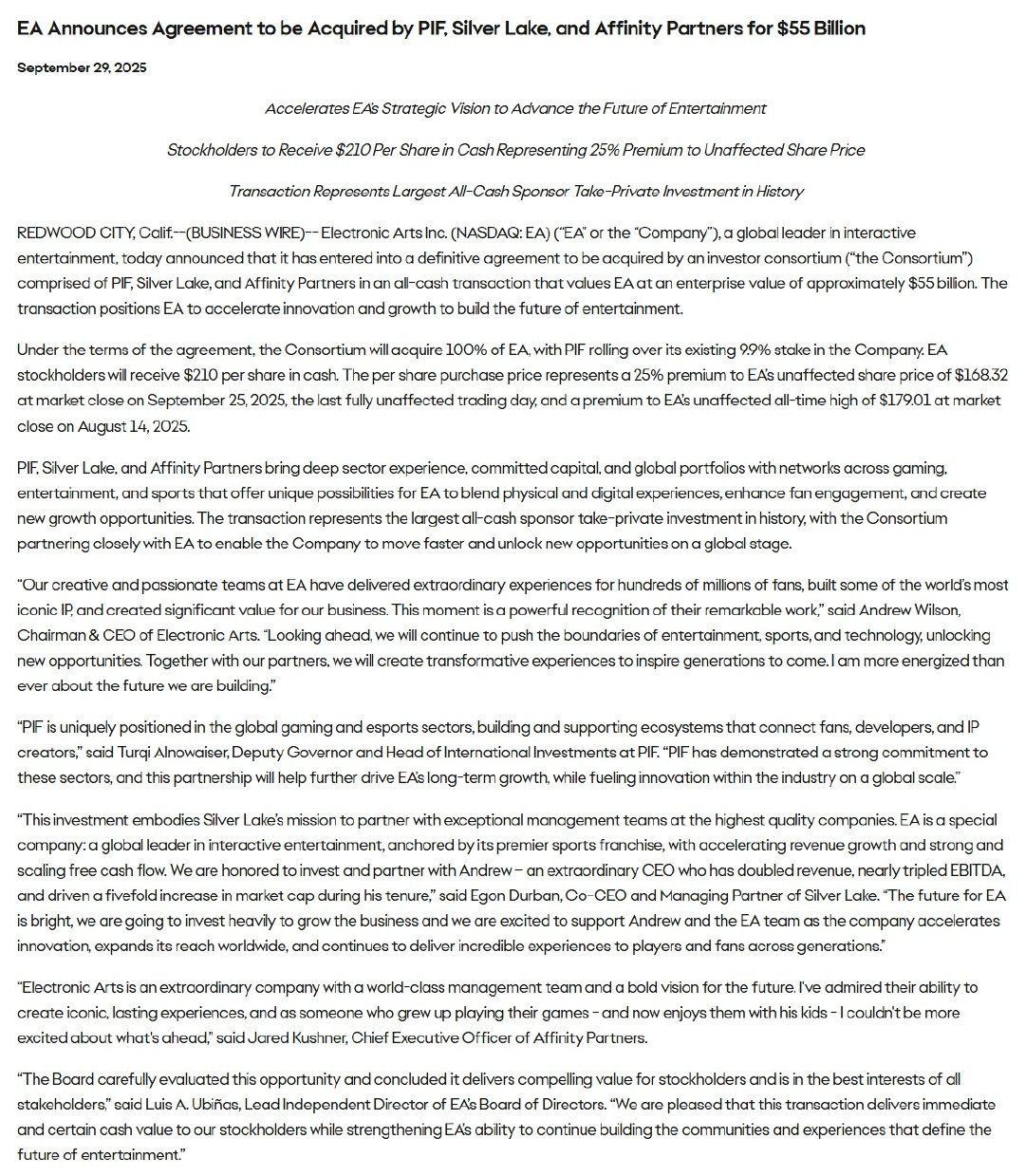 EA宣布同意被沙特公共投资基金(PIF)、银湖资本和库什纳旗下Affinity Partners组成的投资者财团以550亿刀美刀收购,是史上最大规模的全现金私有化交易,此次交易旨在推动EA加速创新与增长。