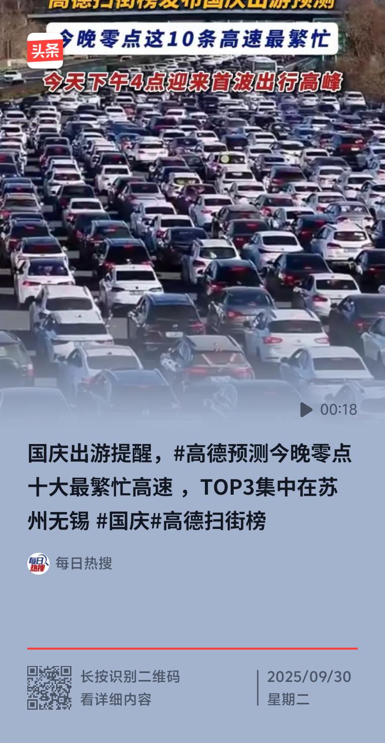 国庆中秋长假要到啦,高德根据路况和大数据预测,今晚零点有10条高速最忙。从9月3