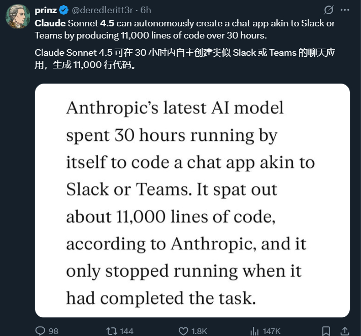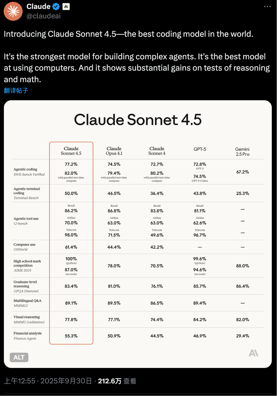 昨天 DeepSeek 刚放出 V3.2-Exp,深夜 Anthropic 立刻回应,带来了 Claude Sonnet 4.5。这一次,Claude 不只喊出了世界最强编程模型的口号,更是把 AI 写代码的极限从 GPT-5 Codex 的 7 小时,一口气拉到 30+ 小时,能生成真正生产力的应用。
