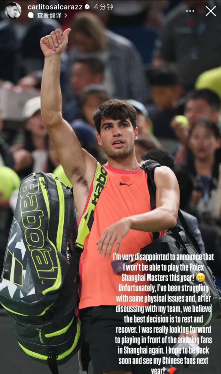 刚刚阿尔卡拉斯通过社交媒体宣布退出上海大师赛!