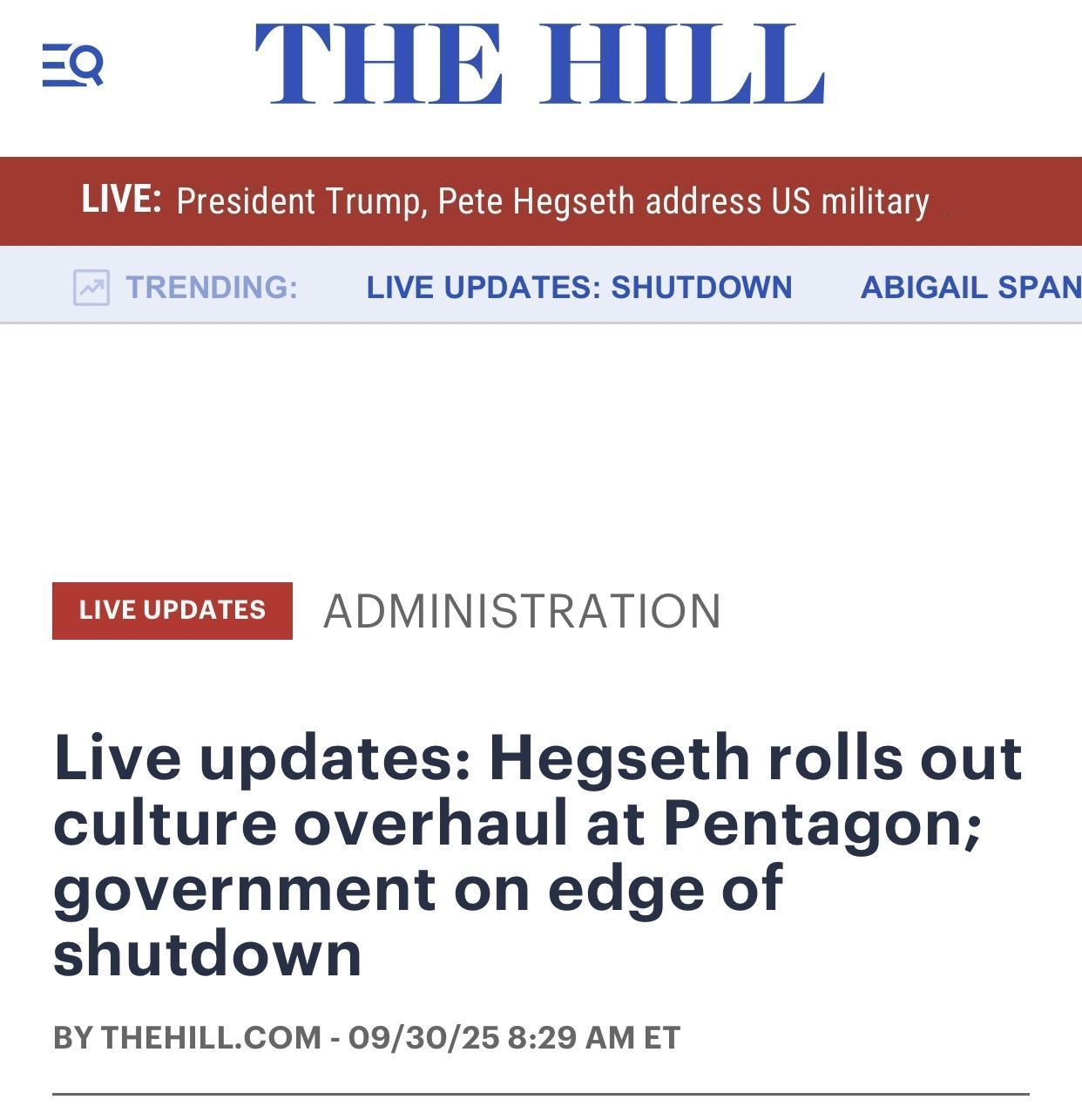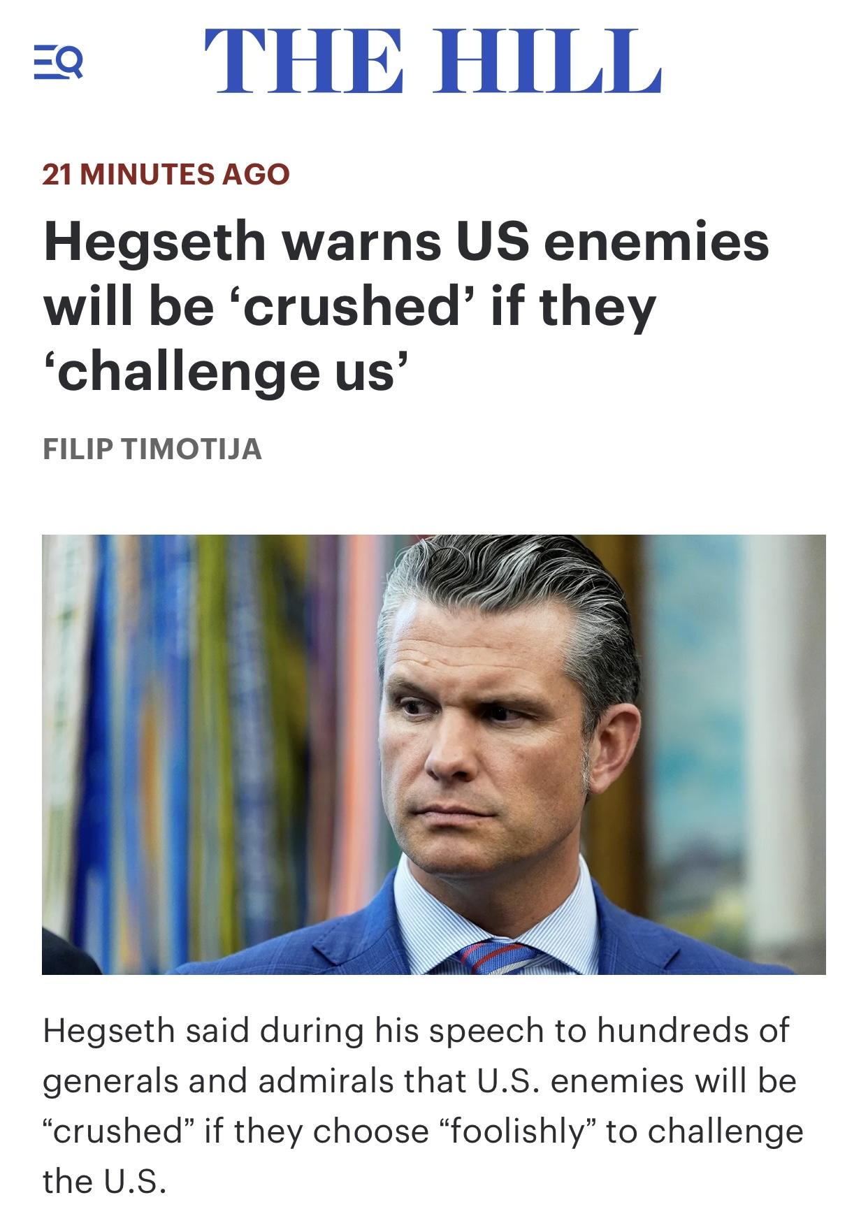 美媒:赫格塞斯宣称”谁挑战美国,谁就将会被粉碎” 美国《国会山报》官网9月30
