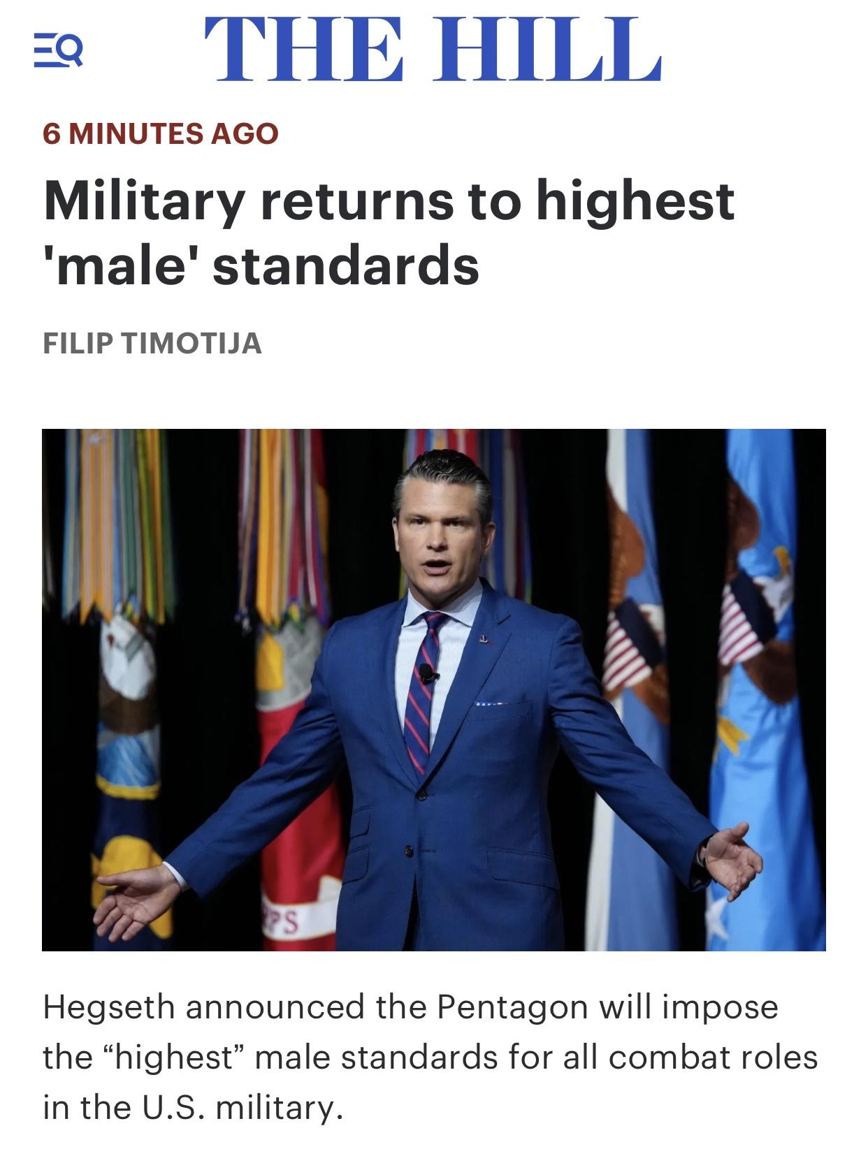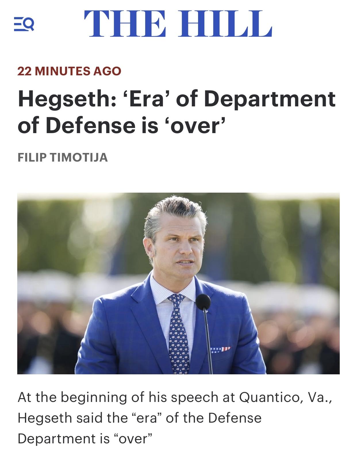 美媒:赫格塞斯宣称”谁挑战美国,谁就将会被粉碎” 美国《国会山报》官网9月30日滚动报道:美国国防部长赫格塞斯周二在弗吉尼亚州匡蒂科(Quantico)的演讲开始时表示,国防部的“时代”已经“结束”。 “早上好,欢迎来到战争部,因为国防部的时代已经结束了”,他对一群将军和海军上将说。 报道说,赫格塞斯表示,今天演讲的主题是“人以及文化”。“今天的主题,是关于我们自己的本质”,他告诉聚集在弗吉尼亚州匡蒂科的数百名将军和海军上将。 赫格塞斯发表讲话时表示,如果美国的敌人“愚蠢地”选择挑战美国,他们将被“粉碎”。“这是一个古老的事实,由于发动战争在鲜血和财富上代价如此高昂,我们欠我们的共和国一支军队,它将赢得我们选择的任何战争或任何强加给我们的战争。如果我们的敌人愚蠢地选择挑战我们,他们将被战争部的暴力、精准和凶猛所粉碎”,赫格塞斯说道。 报道说,赫格塞斯表示,美国国防部“长期以来”出于“错误的原因”提拔军职领导。他说:”长期以来,我们出于错误的原因,提拔了太多的军职领导,基于他们的种族、基于性别配额、基于历史上所谓的‘优先’。我们假装战斗部队和非战斗部队是一样的”。 报道说,赫格塞斯宣布,五角大楼将对美国军队所有战斗岗位实施“最高”雄性标准。“在我的指示下,每个军种将确保每个战斗岗位、每个指定战斗武器岗位的每项要求,都恢复到最高雄性标准,因为这份工作关乎生死,必须达到标准,而且不能只是在每个层面达到标准”,”我们应该寻求超越标准,挑战极限,竞争,这是常识,也是我们是谁、我们做什么事的核心。它应该存在于我们的DNA中”。 报道说,赫格塞斯说明了美国军人的”新仪容标准”:”这也意味着仪容标准。不再留胡子、长发、轻佻的个性表达”,赫格塞斯说。“我们要剪头发、刮胡子,遵守标准”。