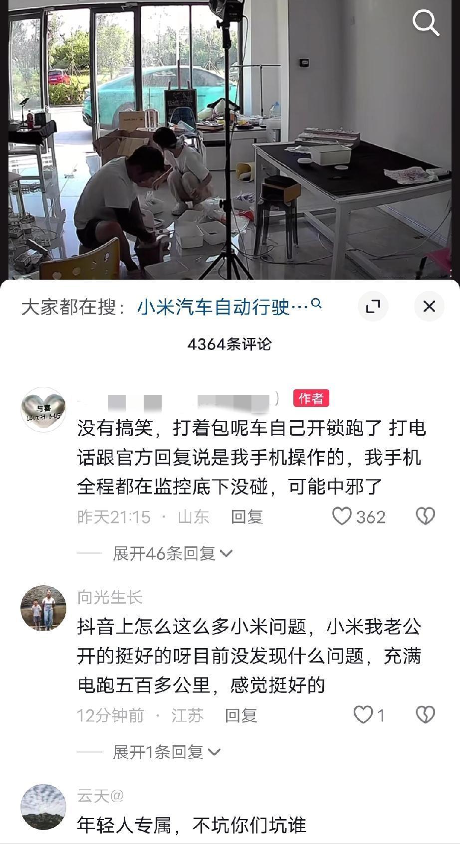 山东某米车主发文称:两个人在店铺里面打着包,停在外面的车毫无征兆的自己开锁跑了,打电话给官方,回复说是我们手机操作的,可手机全程都在监控底下没碰啊…… 为了证明自己没有动手机,网友还挂出了店内的监控视频。 某米这款车上绿化带,撞护栏,甚至红绿灯都看到过,自己开走确实第一次看到,可能正如这位车主所说的,真的是撞了邪了! 有部分网友说车主是为了博流量,自己点的手机。 目前,官方没有进一步的说法,看看某米官方有没有好的说法给出来! 各位看官,你们觉得是什么原因?