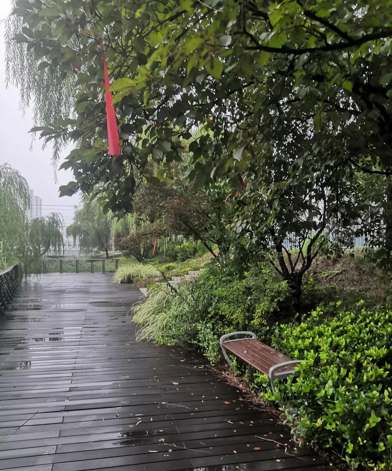 #晒晒秋日最美风光#在虹子河步道旁边的街道树上,挂着很多红丝带,仔细看,有佛系图案和文字,但认不出来是什么文字。 每棵树上都有,有的一棵树上缠着好几根。 这是不是也是祈福用的?