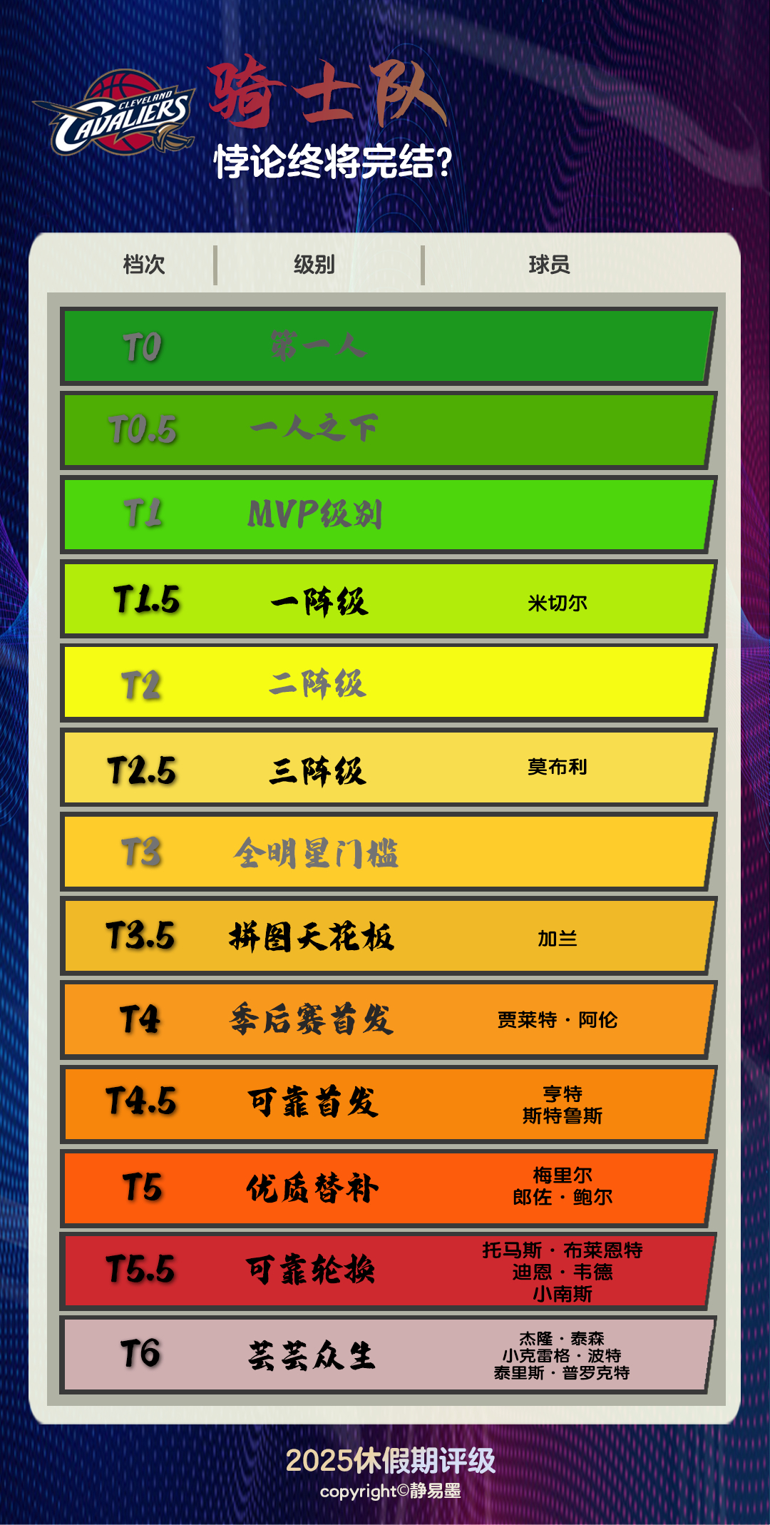 骑士倒也没什么补强。放走杰罗姆引入大球,可能因后场高度提升,拔高了整体防守上限,但大球进攻开发明显不如杰罗姆,比真空实力还是后者更强。只是在东部整体竞争力下滑的背景下,轮换变动带来的影响或许是骑士能承受的。另外,骑士的核心之一莫布利仍处于上升期,隔壁尼克斯没有这种潜在的增量。换句话说,如果骑士现在纸面没有比隔壁差,成长性加持下,他们比隔壁还更有想象空间一些。业绩也普遍看好骑士维持东部第一的战绩。