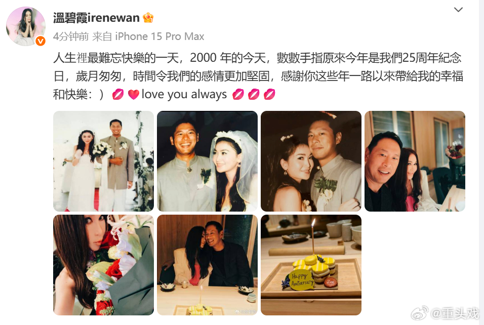 温碧霞晒照纪念结婚25周年 温碧霞发微博晒照纪念和丈夫结婚25周年。