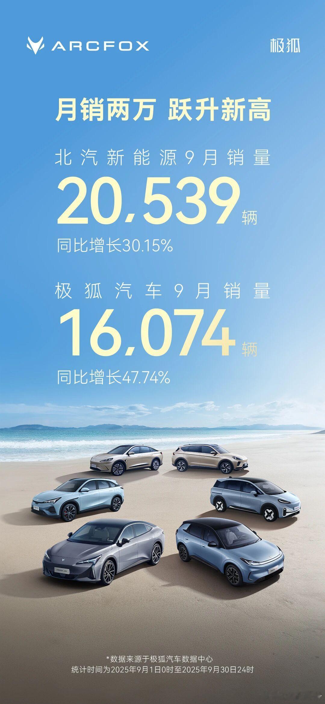 北汽新能源9月销量20.539辆,同比增长30.15%,极狐汽车9月销量16074辆,同比增长47.74%。