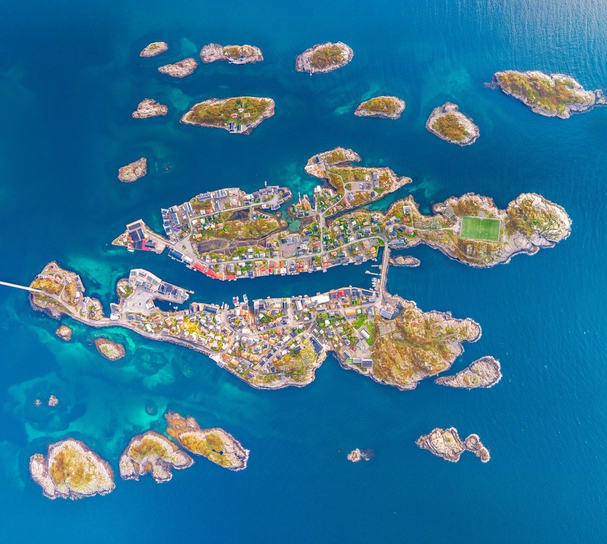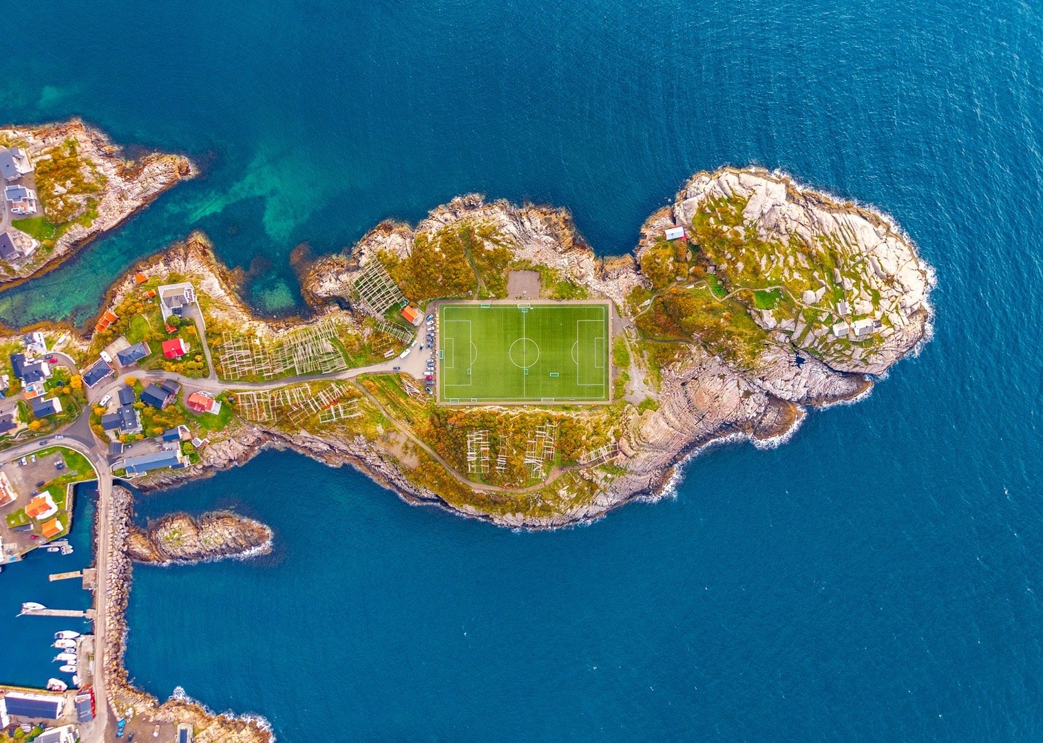 无人机升空,罗弗敦的景致铺成流动的画。最孤独足球场嵌在世界的尽头,成了天地间最暖