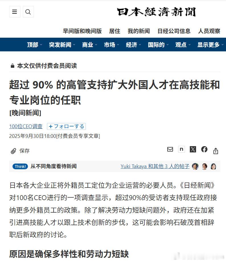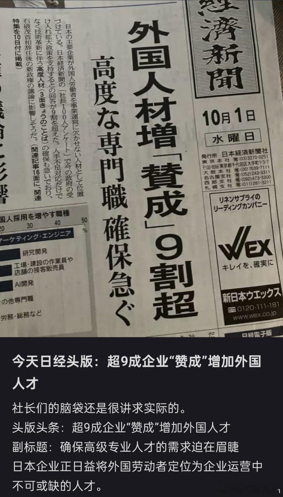 🔻日本媒体头版新闻:超过 90% 的日本企业高管支持扩大外国人才在日本的高技能和专业岗位的任职。日本各大企业正将外籍员工定位为企业运营的必要人员。