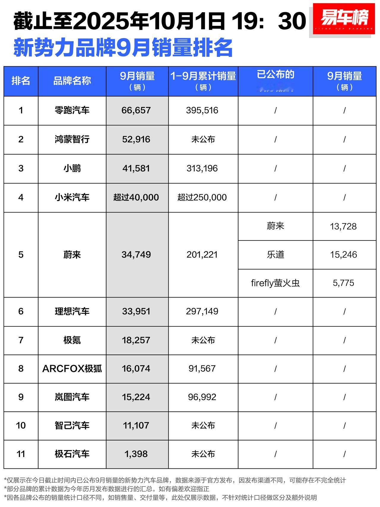 零跑汽车:66657台 小鹏汽车:41581台 小米汽车:超过40000台 蔚来:34749台(蔚来13728台,乐道15246台;萤火虫5775台) 理想汽车:33951台 极氪汽车:18257台 极狐汽车:16074台 岚图汽车:15224台 智己汽车:11107台 极石汽车:1398台 有一些还没公布,当买车参考吧
