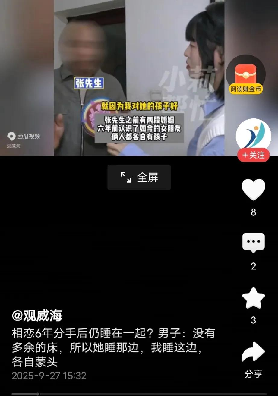 河南郑州,大叔离2次婚后跟漂亮大姐恋爱同居,两人约定只搭伙不领证,谁料,同居后大姐很排挤大叔孩子,他受不了提分手,可大姐却不愿意离开,更荒谬的是,家里只有一张床两人只能睡一起,大叔崩溃了,找来媒体调解,大姐:我跟了他6年,像个保姆一样每天准点给他做饭,他给我2万分手费立马走。大叔冷笑:保姆跟了我6年洗衣机只擦一次,枕头黑得发光? 张大叔曾经有过两段失败的婚姻,他孩子跟着前妻,很少来大叔家。 大叔一个人生活,难免会觉得孤单,他希望能找到一个情投意合地女人来跟他过下半辈子。 6年前,大叔经人介绍认识了一个长相周正的大姐。 大姐跟大叔一样同是离异,她的孩子跟着前夫,大姐和大叔恋爱一段时间后,就搬到大叔家。 两人在一起前约定,因为都不年轻了,所以,没必要领证,两人就搭伙过日子。 起初,两个人在一起,相处得倒也不错,大姐每天准时准点给大叔做饭,大叔给大姐交生活费。 虽然,大叔觉得大姐有点懒,但是他明白,人没有十全十美,要学会彼此包容,所以两人就这样平平淡淡过着。 不过,最让大叔受不了的是,他对自己孩子好的时候,大姐心里很不爽。 尤其是大叔给孩子买东西,给孩子钱花,大姐总明里暗里说要节约钱。 有一次,大叔给他孩子买了一辆电动车,大姐直接发火说,你给你孩子买电动车,我们日子还过不过了? 两人因为这事吵了起来,最终大叔提出分手,大姐也很窝火,分就分,我也看你不顺眼。 大姐拎起行李就走了,可不久,大叔又把她叫回来,希望大姐能跟她好好过日子。 只是,大姐回来后,依然对大叔的孩子很排挤,之后两人又因为这事吵架分手了两回,大叔也叫了大姐两回。 大叔以为,自己三番五次原谅大姐,她会往好的改,谁知道,大姐江山易改本性难移。 大叔觉得很窝火,自己对她孩子掏心掏肺地好,对她也好,她就是接受不了自己的孩子。 大叔下定决心要跟大姐分手,谁知道,这一次大姐同意是同意分手了,可心是分了,人却不走,赖在他家。 两个人每天抬头不见低头见,却是你看我不顺眼,我看你就窝火。 更过分的是,因为家里只有一张床,每天晚上还要睡在同一张床上,因为不想看到对方的脸,上床后就各自蒙头睡, 大叔觉得跟大姐这样的相处模式,快让自己崩溃了,他找来记者调解。 大姐告诉记者,我走了几回,都是他叫我回来,我都觉得丢人。 大叔说,我叫你回来,也是想跟你好好过日子,可你不想让我管我孩,那是我孩我能不管吗? 大姐一听就火了,她骂到,我什么时候说不让你管你孩了,你孩一来我就走开。 记者问大姐,那你跟大叔还有好的可能吗,你们心平气和地谈谈,好好过日子。 大姐说,没有商量的余地,不可能好了,大叔也说坚决分手。 大姐跟记者提出,只要他给我2万块分手费,我立马从这个家搬出去。 大叔一听就火了,他说,你住我房子,吃的、用的都是我买,水电费、物业费都是我交,你应该给我房租,给我钱,而不是让我给你。 大姐说,我每天准时准点给你做饭,6年来像个保姆一样伺候你,我没有功劳也有苦劳。 大叔冷笑:“保姆?有哪个保姆6年来只擦洗衣机一次,我的枕头多久没洗了?又黑又脏,你的枕头更是黑得发光。” 大叔又问,6年来我给你、给你孩买东西,你给我和我孩买过东西吗? 大姐承认从来没买过东西。记者说,既然你们没有好的可能,那就放过彼此,不要相互折磨,过好各自的日子。 最终两人在记者的调解下,愿意各让一步,好好协商分手费问题,做到好聚好散。 从法律角度,怎么看待这件事呢? 1. 《最高人民法院关于适用〈民法典〉婚姻家庭编的解释(二)》第4条规定,双方均无配偶的同居关系析产纠纷案件中,对同居期间所得的财产,有约定的按照约定处理。 没有约定且协商不成的,各自所得的工资等归各自所有;共同出资财产等按出资比例并综合贡献等分割。 本案中,张大叔与大姐未约定财产归属,房屋、生活费、水电物业费等均由大叔单独支出,属其个人财产。 大姐做饭属日常照料,未产生共同财产,其主张2万分手费无直接法律依据,大叔要求大姐支付房租亦缺乏共同财产分割的基础,双方争议需基于实际贡献协商。 2. 《民法典》第240条规定,所有权人对自己的不动产或者动产,依法享有占有、使用、收益和处分的权利。 本案中,案涉房屋为大叔所有,他对房屋享有完全物权。双方明确解除同居关系后,大姐丧失继续居住的合法依据,其拒不搬离的行为侵犯了大叔的所有权。 大叔作为所有权人,有权依法要求大姐腾退房屋,若协商无果可通过法律途径维权。 最后,我想说,这两人都把“搭伙”当临时避风港,却没立好规矩。感情淡了,体面散场最要紧。 大叔该尊重对方的付出,大姐也应体谅他对孩子的责任。 与其互相指责,不如坐下来,算清各自的投入与损失,尽快达成一个双方都能接受的分手方案。 大家说对吗? 关注@猫眼学法 学习更多法律知识。