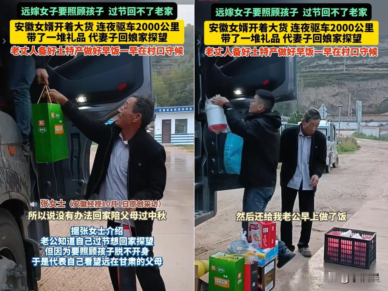 远嫁姑娘国庆回不去娘家, 老公开货车绕路替她看爸妈, 这哪是“顺路”,分明是把妻子的牵挂揣进了心里! 甘肃姑娘嫁去安徽,带着孩子没法赶回老家过节,她老公从上海装完货,特意绕路去了岳父母家,还提前买好了水果礼品。 岳父早早就骑着车在路口等,手里攥着热乎的早餐;走的时候,老两口又往车上塞了一大袋土特产,全是自家种的、攒的好东西。 没有啥花里胡哨的讲究,就“你惦记我女儿,我疼你赶路辛苦”的实在劲儿。 网友说这女婿难得,可我觉得,最难得的不是他绕了路,是他懂远嫁的难,知道妻子想爸妈却回不去,就替她把孝心送到。 知道岳父母过日子俭省,就直接把礼品备齐,不叫老人操心。 远嫁最怕的从不是路远,是没人懂你心里的牵挂。 你们身边有这种把另一半的家人,真当自己家人疼的例子吗?