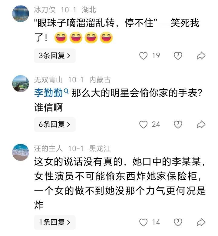 你说史晓燕这个大姐是不是疯了? 史晓燕又在蛐蛐演员李某某偷她四块金表,还炸她的保险柜! 史晓燕不做演员真的可惜了,她形容这个演员李某某,说她眼睛不安分,滴溜溜的转,没有停止过。 史晓燕说,她有6块金表,其中4块放在床头,两块放在保险柜。但是那4块就不见了,是演员李某某偷走了。 说李某某还炸她家的保险柜,但是好在保险柜质量好,没炸开! 史晓燕说,她推测这个李某某可能是有某种心理疾病,她知道偷东西犯法,但是就是控制不住! 在史晓燕的视频下面,很多人都说史晓燕说的演员李某某是李勤勤,不知道真还是假! 不管真假,但是怎么感觉史晓燕这大姐精神没问题吧?蛐蛐完自己闺女,蛐蛐儿子,然后前夫,前前夫,这又是朋友,身边没好人了。