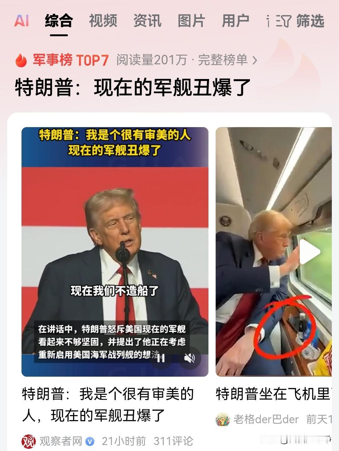 对于特朗普的审美来说,现在的战舰真的是很丑,他喜欢的还是过去的大舰巨炮时代的风格! 特朗普在对美国将军们演讲的时候,公开表示。 现在的战舰真的不好,非常丑,一点美感都没有。 我觉得我们还是要恢复战列舰风格。 不要搞什么铝合金了,还是要搞钢铁战舰。 哎呀,这个老头真的是疯了,战列舰那都是什么年代的产物了? 当导弹横空出世之后,战列舰已经走到它的终点。 舰炮的射程再远也比不上导弹啊,至于说精度方面更不要说了,那都没法比! 特朗普为什么要说这番话呢?实际上就是因为美国现在在新式军舰上已经彻底落伍了。 他们的造舰能力已经崩了。 我没有,我搞不出来,那我就抹黑你。 看着别人家吃排骨,自己手里只有两根咸菜。 然后就跟自己家里说,排骨最不好吃了,都是臭的! 还是咱们家的咸菜最好吃! 好吧,特朗普你开心就好,慢慢玩儿吧! 当然了,有一点咱们不否认,过去战列舰时代的那种大舰巨炮风格确实充满了铁血的美感! 那是上百年历史所积淀下来的一种审美,好看是真好看啊! 但是你不能光看好看不好看,你也得战斗啊! 坦克车的钢铁洪流直接碾压过去,那场景更加壮观。 可是却架不住一两千美元一架的无人机进攻! 你说那单薄的四轴无人机,跟厚重的主战坦克比哪个更好看一些呢? 战争不是比审美的,战争那是分生死的地方! 特朗普你作秀可以对红脖子们作秀,你在人家专业的将领面前大放厥词,这只能是徒增笑柄了! 对了,还有一件事儿,希望特朗普要明白。 你们美国现在钢铁业也已经没落了。 就算你想修建战列舰,估计特种钢材也得进口! 咱们中国产量最大,你买不买呢?
